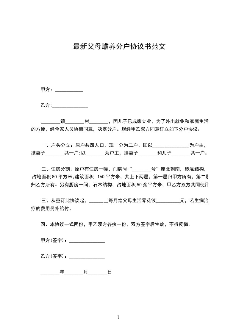 ________镇________村________,因儿子已成家立业,为了外出就业和家庭生活的方便,经全家人员协商同意,决定分户。现经甲乙双方同意订立如下分户协议: