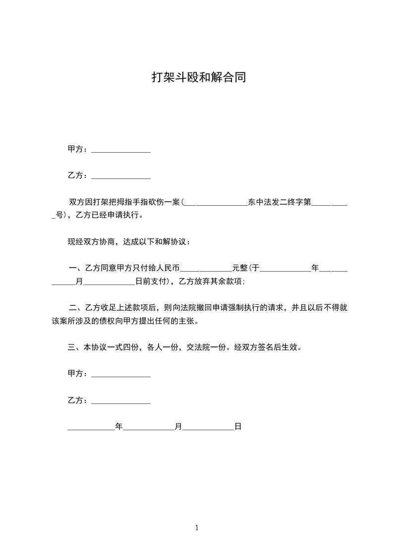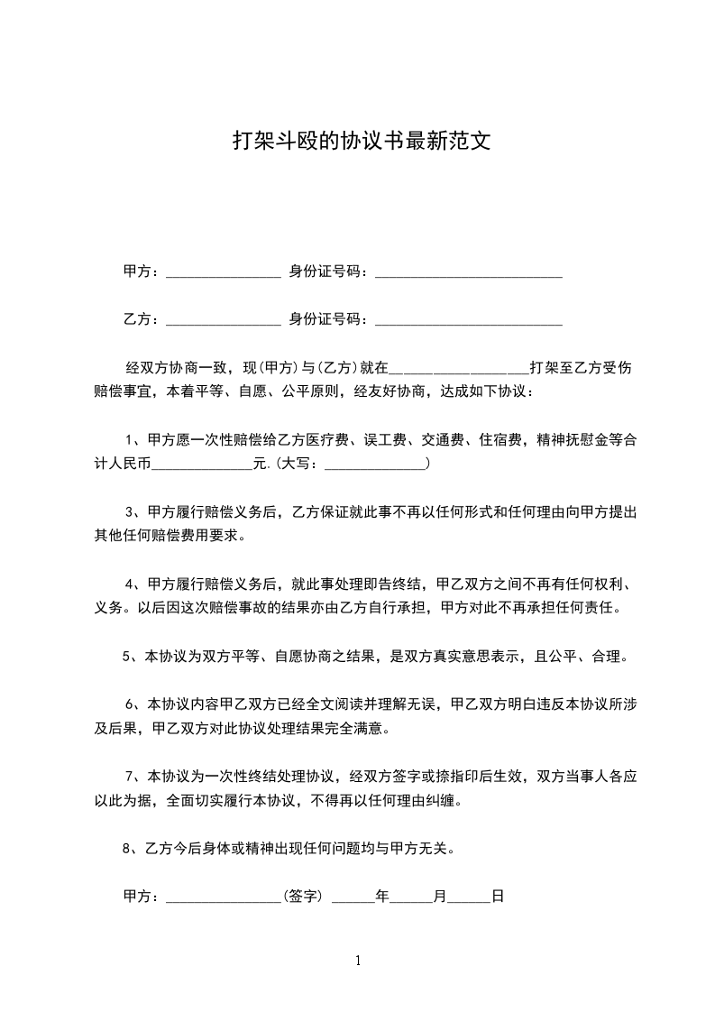 兹因甲、乙双方在施工过程中,双方发生打斗,现经双方协商一致,(甲方)与(乙方)在打架至乙方受伤赔偿事宜,本着平等、自愿、公平原则,经友好协商,达成如下协议: