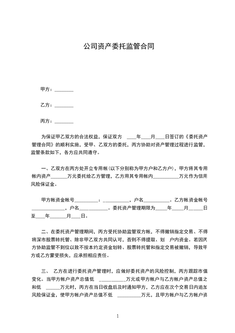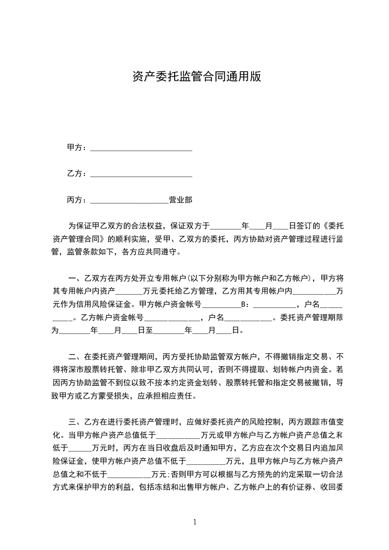 为保证甲乙双方的合法权益,保证双方于____年____月____日签订的XX托资产管理合同》的顺利实施,受甲、乙双方的委托,丙方协助对资产管理过程进行监管,监管条款如下,各方应共同遵守。