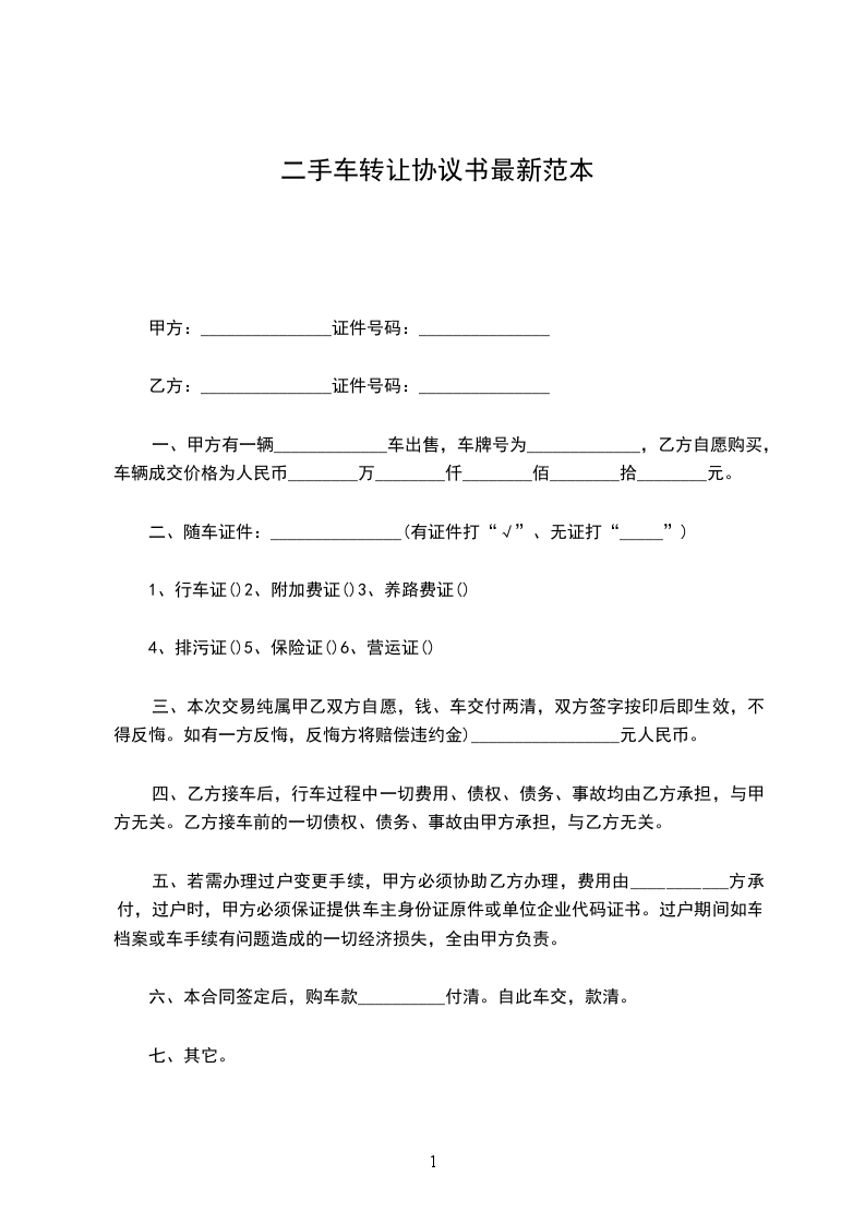 一、甲方有一辆_____________车出售,车牌号为_____________,乙方自愿购买,车辆成交价格为人民币________万________仟________佰________拾________元。