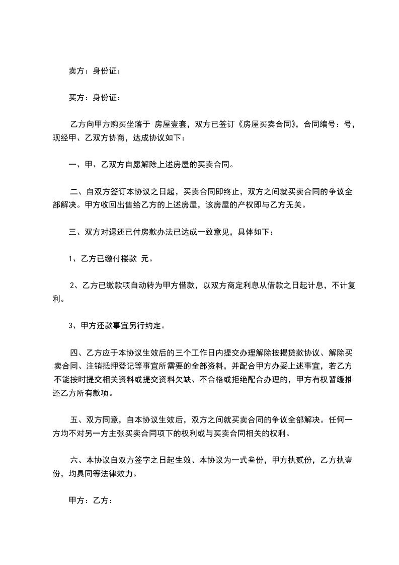 三、原双方签订的商品房买卖合同在甲乙双方签署本协议后随之作废。甲方在乙方签署本协议并到房管部门备案后,即可以任何方式处分该房屋。