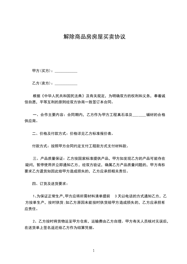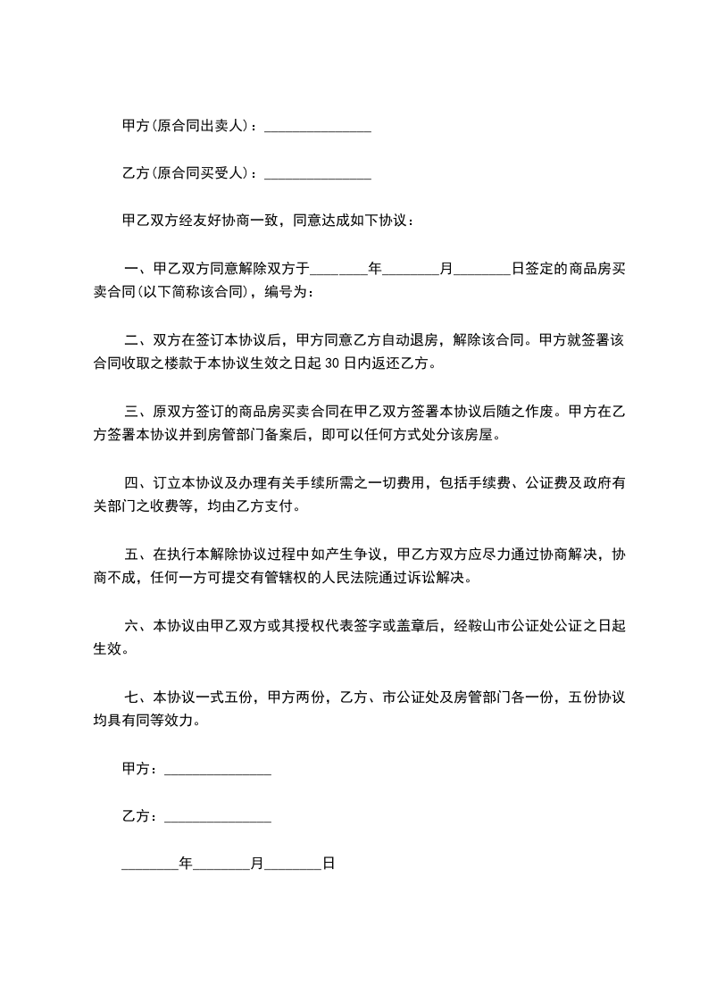 一、甲乙双方同意解除双方于________年________月________日签定的商品房买卖合同(以下简称该合同),编号为: