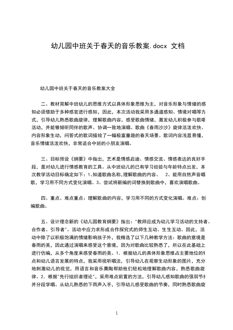 七、教学过程(一)引入活动,激发兴趣。出示课件,引导幼儿观察,相互交流。师:春天来了,我们身边都有哪些变化呀?幼儿自由讲述教师小结:春姑娘悄悄地来到我们的身边,它带来了许多它的好伙伴,就连小雨也迫不及待的唱起了歌,你们听……第一环节导入,引起幼儿的兴趣,在引导幼儿讨论"春天来了,身边的变化"同时,为下面创编歌曲做了铺垫。幼儿观看课件,体验感受歌曲的活泼优美的情趣,把握歌曲的情感线路,使幼儿能进入春雨美的意境中来。(二)欣赏歌曲1、完整欣赏师:刚才你听到谁在说话?它说些什么?每个孩子都是独立的个体,他们的思维方式和感受都有所不同,回答可能多种多样。如何提升幼儿对春天的认识,使他们的学习变得主动而且有意义,需要老师灵活机智的引导。歌曲的第一段与第二段节奏相同,但歌词内容有明显的区别,所以我先让幼儿熟悉第一段。2、再次欣赏师:下了春雨后,种子就好像喝了水,很快就发芽就长大了,这时候种子心里怎样的?引导幼儿表现活泼优美的情趣。《纲要》中指出,幼儿园教育应尊重幼儿的人格和权利,尊重幼儿的身心发展规律和学习特点,关注个别差异,促进幼儿富有个性的发展。(三)学唱歌曲1、用几种不同的演唱方式激发幼儿学唱的兴趣。如:教师领唱幼儿用单音字哼唱旋律:啦啦啦……、教师和幼儿互相接唱、边做动作边唱等等。孩子对一种表现方式的兴趣不是非常持久,所以我们可以尝试让孩子用不同唱的形式来学唱歌曲。在日常的教学活动中,这样变化的方式很受孩子欢迎。同时,幼儿在学习第一段歌曲的基础上,对歌曲的旋律和节奏已经有一定的感知,很快就能跟上老师的领唱。2、分组对唱歌曲(幼儿两两结伴,分别扮演春雨和种子)问答式的歌曲非常适合孩子们进行对唱。在这环节中,我先采用老师与幼儿问答对唱的方式(老师扮春雨,唱:"春雨春雨沙沙沙,沙沙沙,种子种子在说话,在说话"。孩子扮种子,唱:"哎呀呀,雨水真甜,哎呀呀,我要发芽。")再请幼儿自由分组进行对唱,随后请个别幼儿与集体对唱……尽可能多地为幼儿提供表现的机会,让幼儿在不同的演唱过程中体验歌曲愉快的情绪,以及歌曲的节奏。《纲要》中指出,老师要培养幼儿大胆的表现自己情感和体验的能力、鼓励幼儿用自己喜欢的方式进行艺术表现活动,所以我采用多种对唱的方式鼓励幼儿表演歌曲,这是孩子领会歌曲的一种升华,也是孩子们喜欢的一种学习方式。师幼互动的关键是为幼儿提供宽松和谐的环境,激发幼儿积极回应老师的提问,开放性的问题有助于拓展幼儿的思维,主动回忆日常生活中积累的有关春天的知识。在这个问题中,隐含了歌词的内容,巧妙地借助图片所展示的图像,帮助幼儿理解并熟悉歌词。同时,也为幼儿熟悉歌曲节奏做了铺垫。(四)体验感受师:下雨了,除了种子,还有谁也会很开心呢?你猜它会怎么说?引导幼儿尝试进行仿编。在进行仿编的过程中,体验不同角色表演时的不同心情。第四环节是体验感受,通过用活泼优美的情趣演唱歌曲来感受春雨美的意境。活动的延伸是为了孩子再一次巩固所学到的本领,并给每个孩子都有表现表达的机会,让他们充分感受到成功的喜悦,以增强他们的自信心。孩子们在春天的主题活动中积累了很多有关春天的知识,也一定能够创编出很多新的歌词,我鼓励他们相互做小老师,学学别人编的新词,既满足了幼儿充分表现自己的需要,也为孩子们巩固歌曲旋律、节奏提供了反复的练习机会。