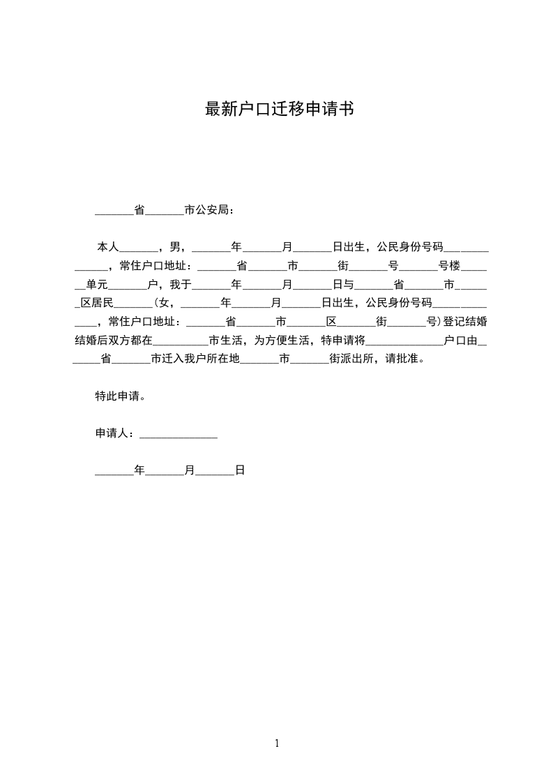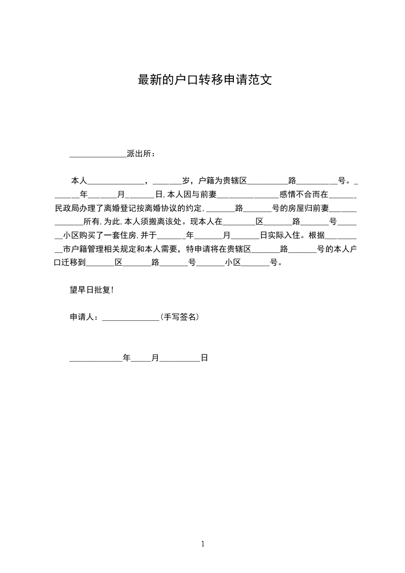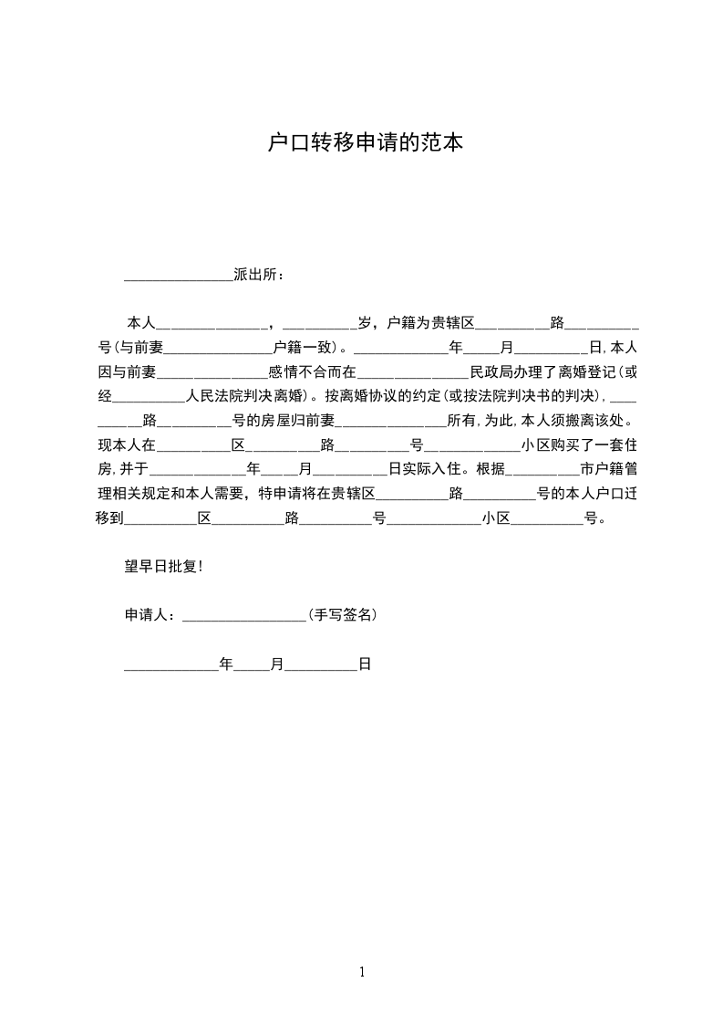 本人______________,_______岁,户籍为贵辖区__________路__________号。_______年_______月_______日,本人因与前妻_______________感情不合而在_______民政局办理了离婚登记按离婚协议的约定,_______路_______号的房屋归前妻______________所有,为此,本人须搬离该处。现本人在________区_______路_______号_______小区购买了一套住房,并于_______年_______月_______日实际入住。根据__________市户籍管理相关规定和本人需要,特申请将在贵辖区_______路_______号的本人户口迁移到_______区_______路_______号_______小区_______号。