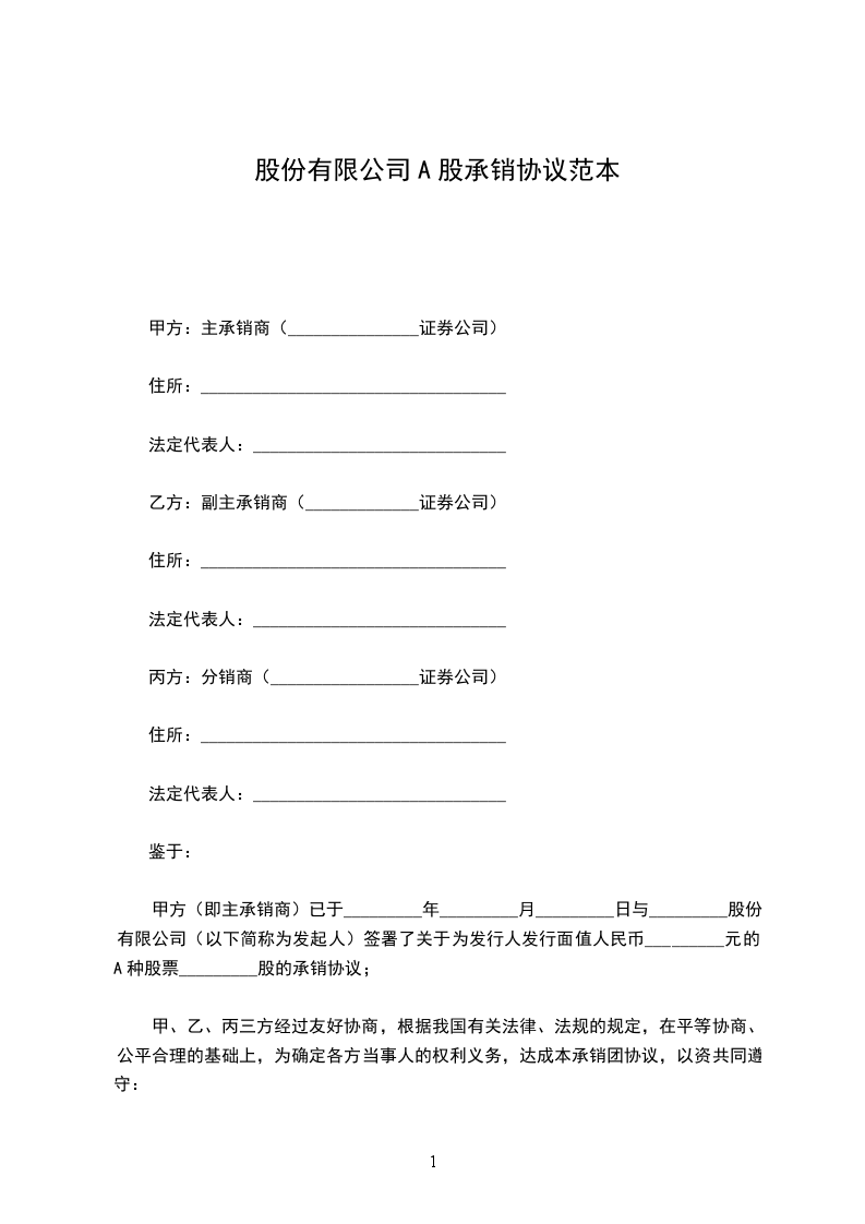 甲方(即主承销商)已于_________年_________月_________日与_________股份有限公司(以下简称为发起人)签署了关于为发行人发行面值人民币_________元的A种股票_________股的承销协议;