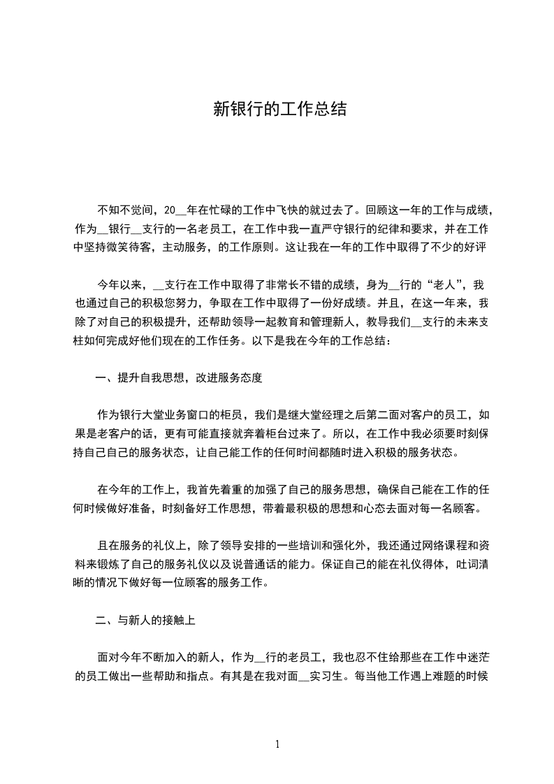 不知不觉间,20__年在忙碌的工作中飞快的就过去了。回顾这一年的工作与成绩,作为__银行__支行的一名老员工,在工作中我一直严守银行的纪律和要求,并在工作中坚持微笑待客,主动服务,的工作原则。这让我在一年的工作中取得了不少的好评。
