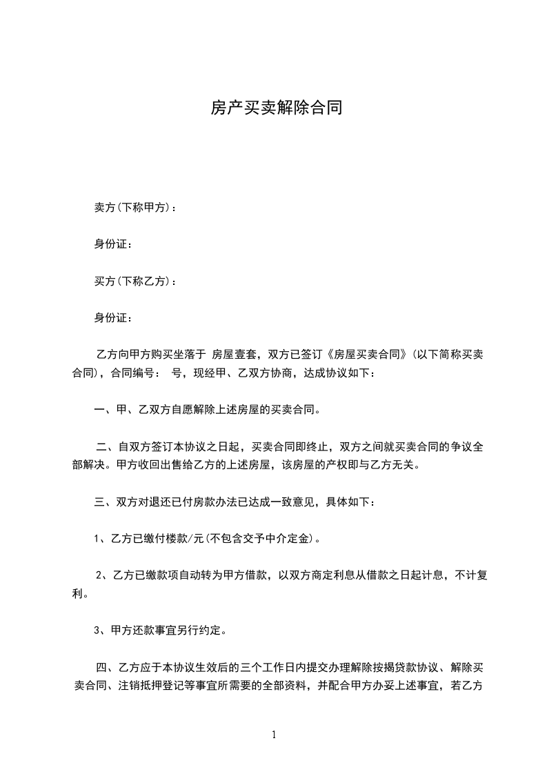 四、在乙方办理好退房手续后五个工作日内甲方将乙方的首付款________万元退还给乙方,将购房贷款________万元退还给________银行________分行,归还银行利息的部分由乙方负责偿还。