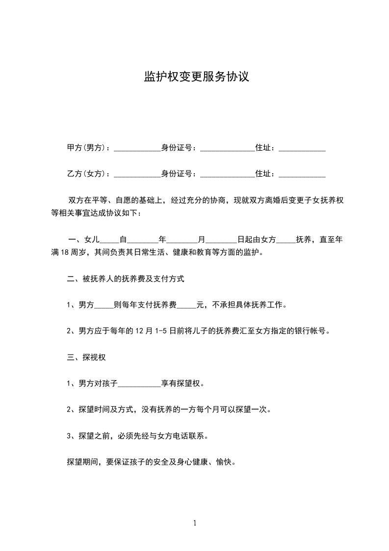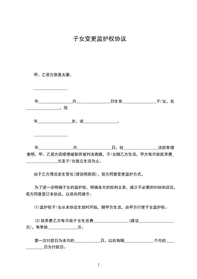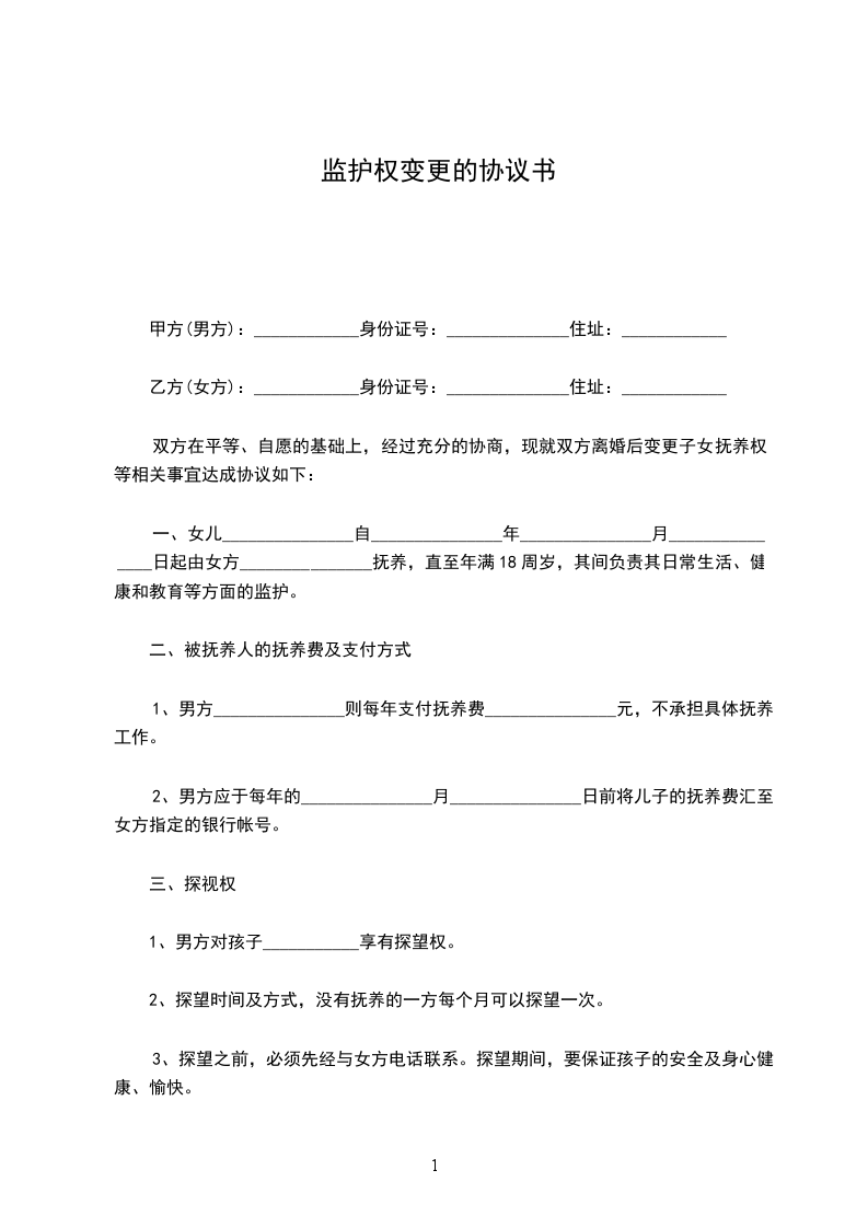 双方在平等、自愿的基础上,经过充分的协商,现就双方离婚后变更子女抚养权等相关事宜达成协议如下: