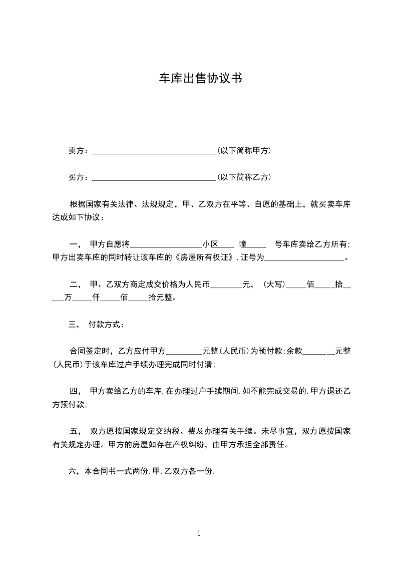 三、付款方式: 一次性结清。在甲乙双方签订本协议书后,甲方先交付车库钥匙,由乙方检查电动升降器及内部设施无异后,支付相应款项,甲方出具车库权属证明和收据后,车库所有权归乙方。