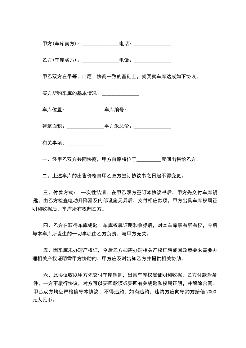 六、此协议收以甲方先交付车库钥匙,出具车库权属证明和收据,乙方付款为条件,一方不履行协议,对方可以要回款项或要回有关钥匙和权属证明,并解除合同。甲乙双方均应严格信守本协议,不得违约,如有违约,违约方应向守约方赔偿2000元人民币。