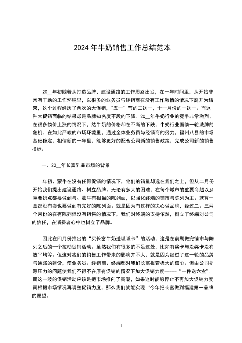 20__年初随着从打造品牌、建设通路的工作思路出发,在一年时间里,从开始非常有干劲的工作环境里,以很多的业务员与经销商在没有工作激情的情况下离开为结束,这个过程经历了两次的大促销,“五一”节的二送一,十一月份的一送一。而这种大促销面临的结果却是品牌知名度不段的下降。20__年牛奶行业的竞争非常激烈,在很多物价上涨的情况下,然牛奶的价格却在不断的下跌,牛奶行业面临一轮洗牌的危机。在如此严峻的市场环境里,通过全体业务员与经销商的努力,福州八县的市场基础稳定,相信新的一年里,能够更好的配合公司新的销售政策,完成公司新的销售指标。