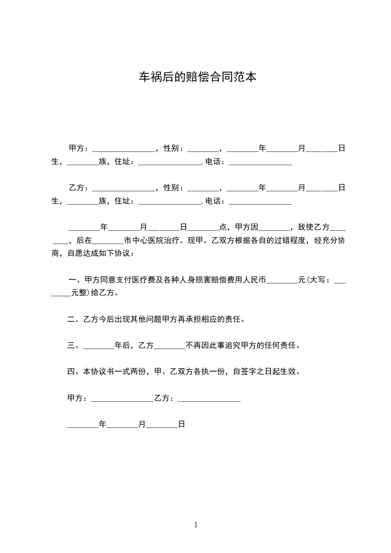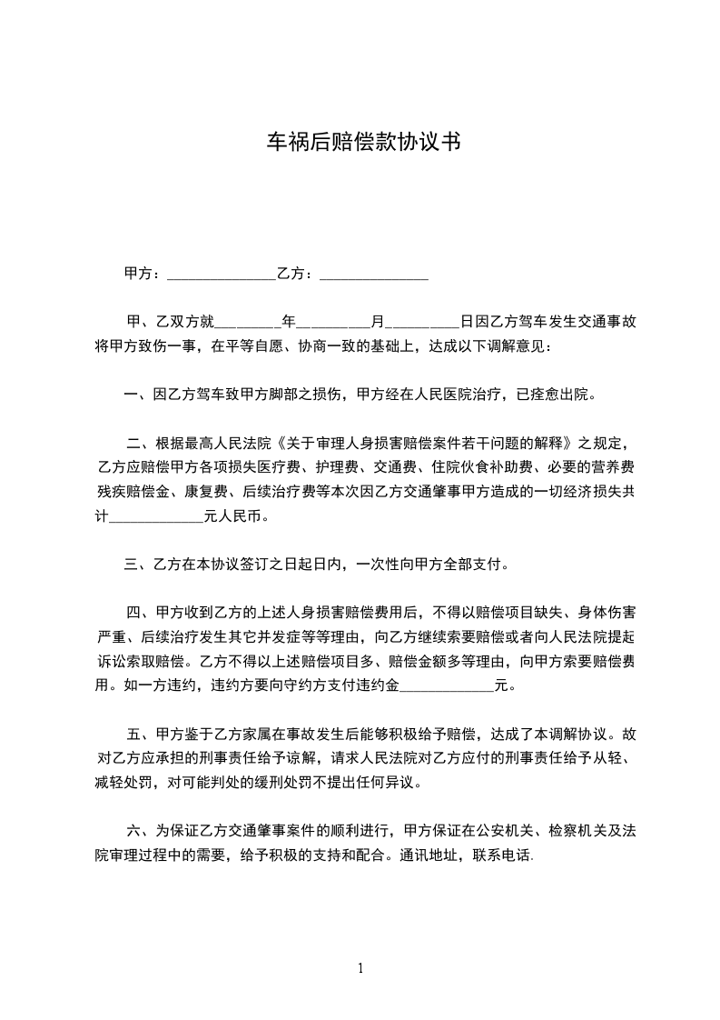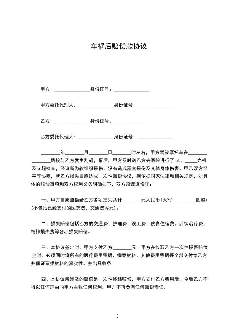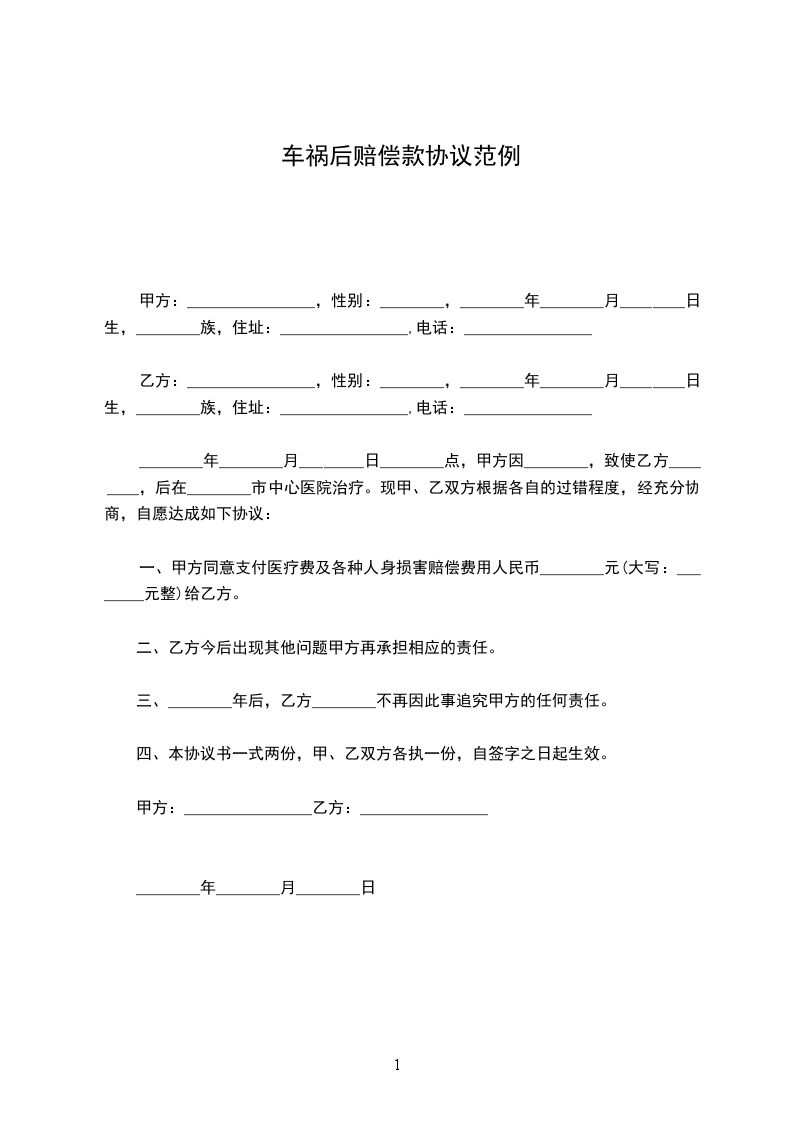 车祸后赔偿款协议范例