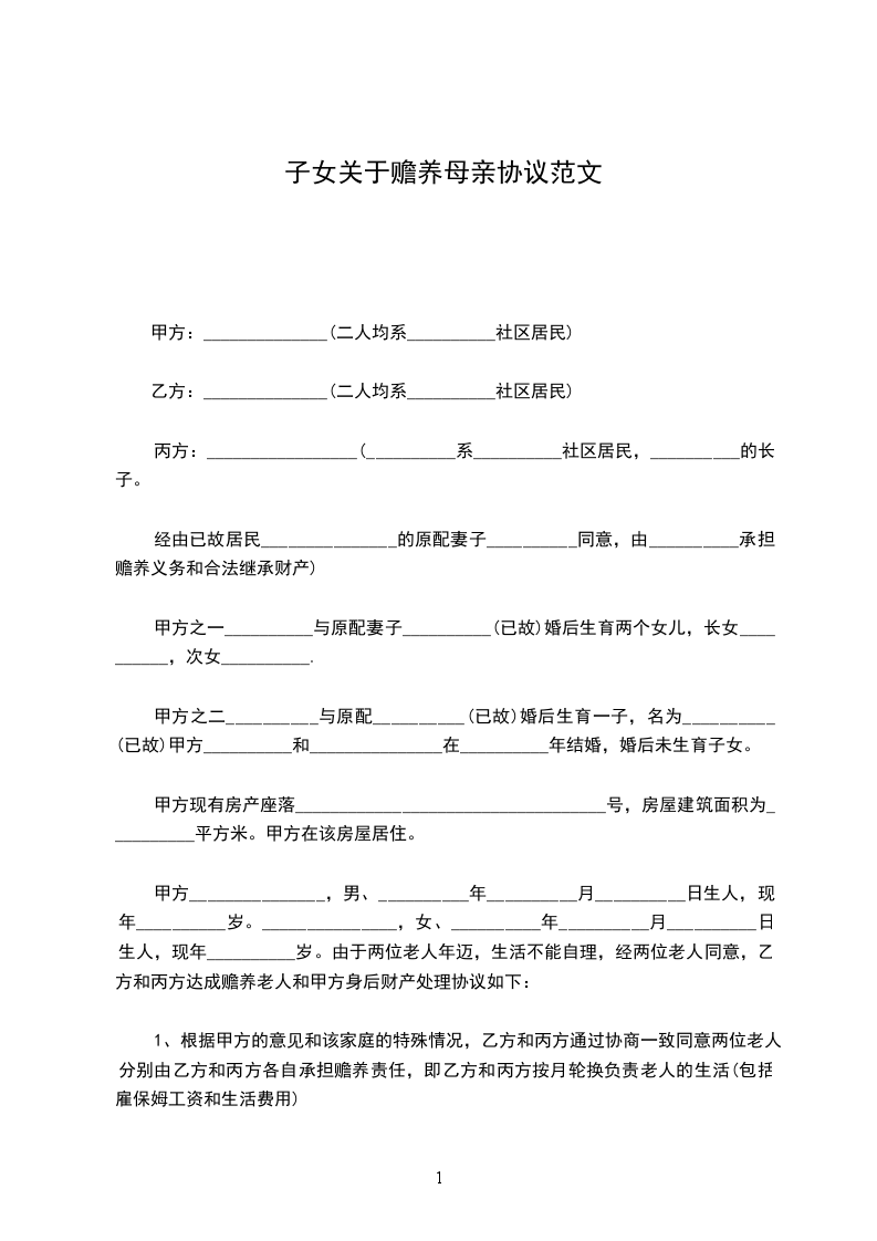 甲方_______________,男、__________年__________月__________日生人,现年__________岁。_______________,女、__________年__________月__________日生人,现年__________岁。由于两位老人年迈,生活不能自理,经两位老人同意,乙方和丙方达成赡养老人和甲方身后财产处理协议如下:
