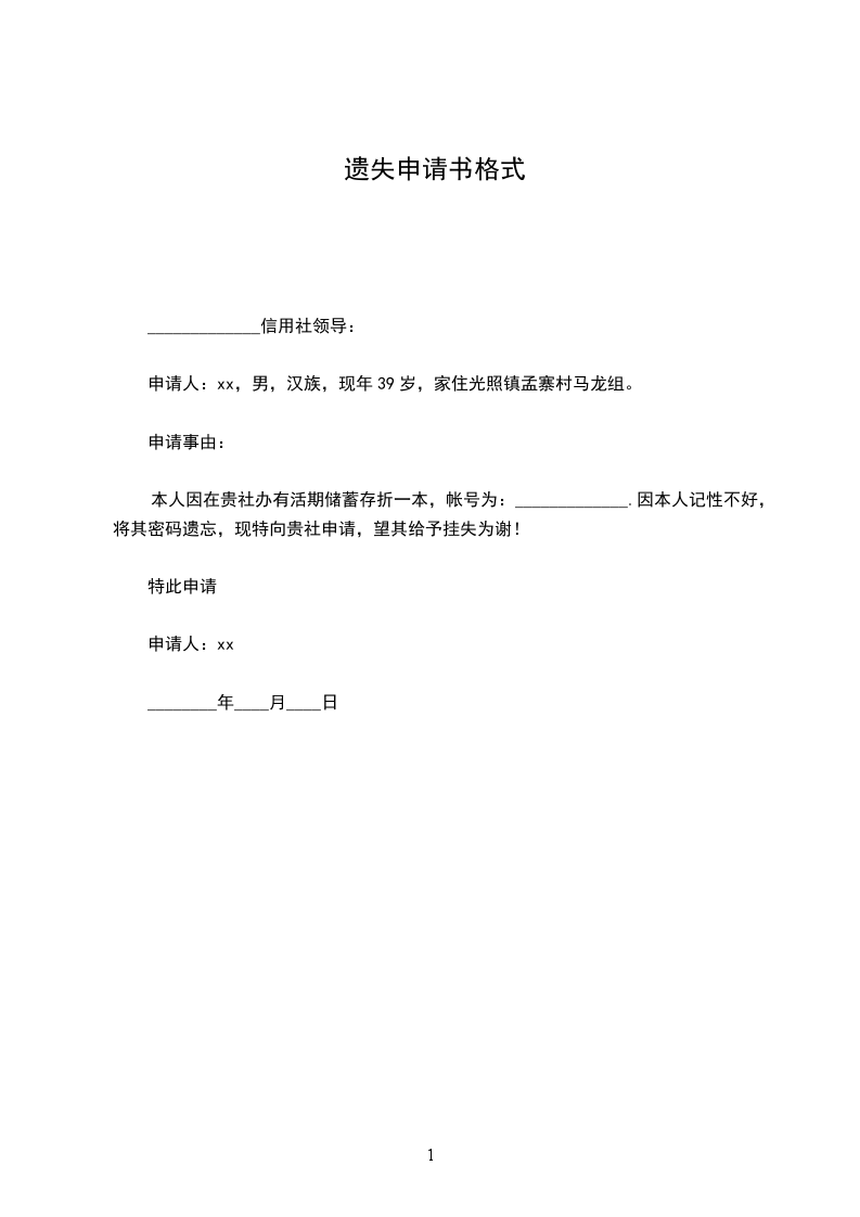 本人因在贵社办有活期储蓄存折一本,帐号为:_____________.因本人记性不好,将其密码遗忘,现特向贵社申请,望其给予挂失为谢!