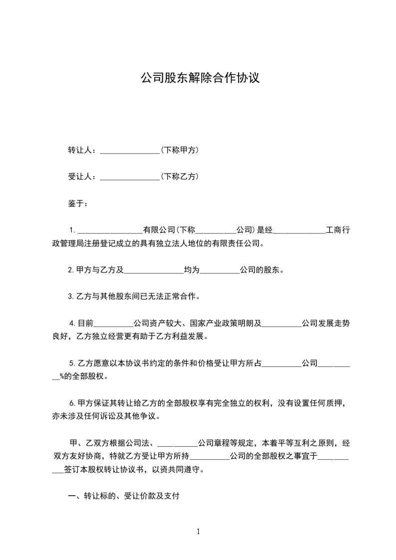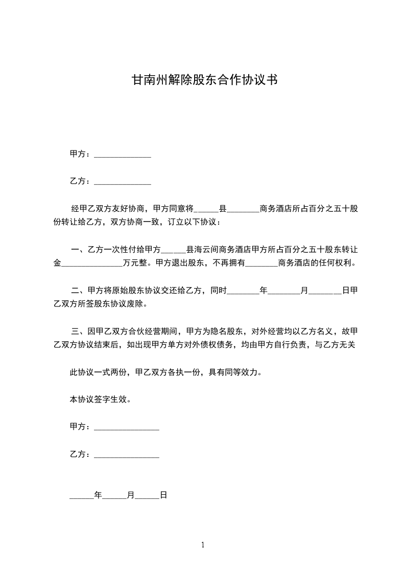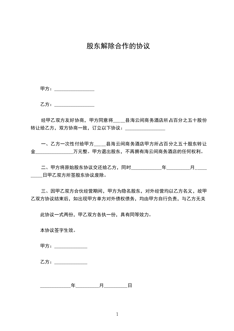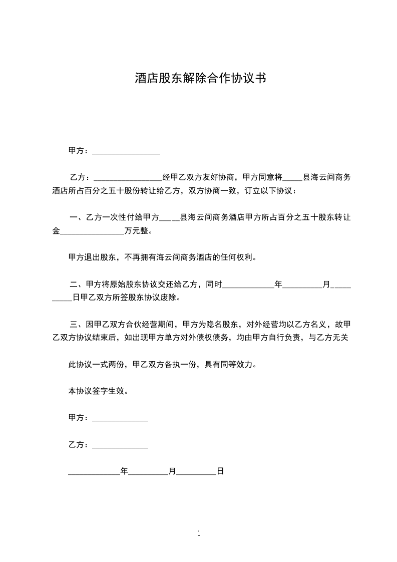 一、乙方一次性付给甲方_____县海云间商务酒店甲方所占百分之五十股东转让金________________万元整。甲方退出股东,不再拥有海云间商务酒店的任何权利。