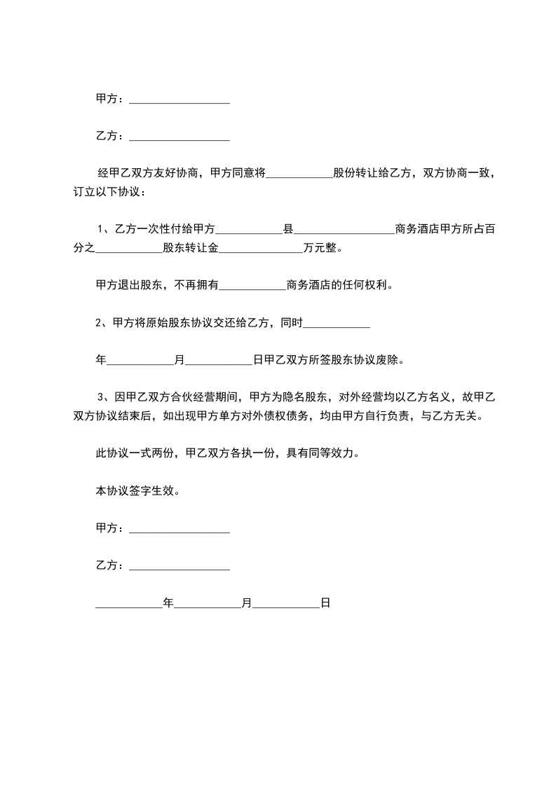 经甲乙双方友好协商,甲方同意将_____县海云间商务酒店所占百分之五十股份转让给乙方,双方协商一致,订立以下协议:_________________