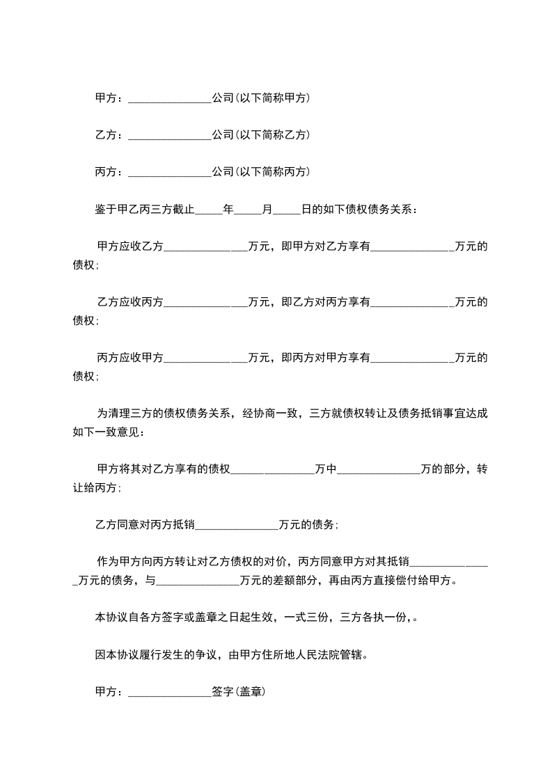 作为甲方向丙方转让对乙方债权的对价,丙方同意甲方对其抵销_______________万元的债务,与_______________万元的差额部分,再由丙方直接偿付给甲方。