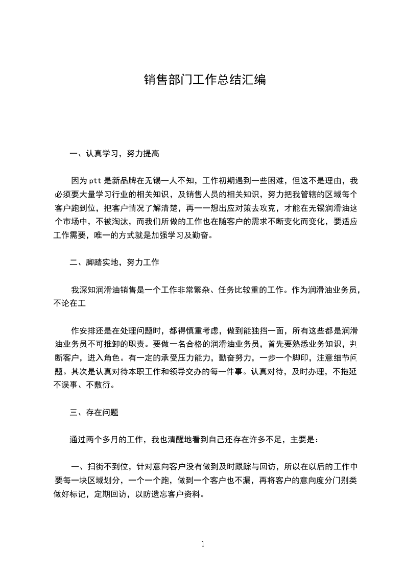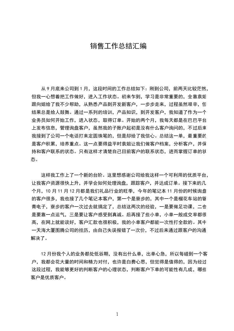 从9月底来公司到1月,这段时间的工作总结如下:刚到公司,前两天比较茫然,但我一心想着把工作做好,进入工作状态。初来乍到,学习是非常重要的,全靠袁姐跟向姐给了我不少帮助,从熟悉产品到开发新客户,一步步走来,过程虽然艰辛,但结果总是给人鼓舞。通过一系列的培训,产品知识,到开发客户,我知道了作为一个业务员如何开始工作,进入状态,取得订单。开始的两个月,我每天都是在巴巴平台上发布信息,管理询盘客户,虽然我的子账户起初是没有什么客户询问的,不过后来我接到了公司一个电话打来定圆珠笔的,但是却给了我信心。总结这一单,最重要的是客户积累,培养重点。这一点要得益平时袁姐让我们做客户档案,分析客户,并保持和客户联系的状态。只有这样才清楚自己目前客户的联系状态,进而掌握订单的状态。