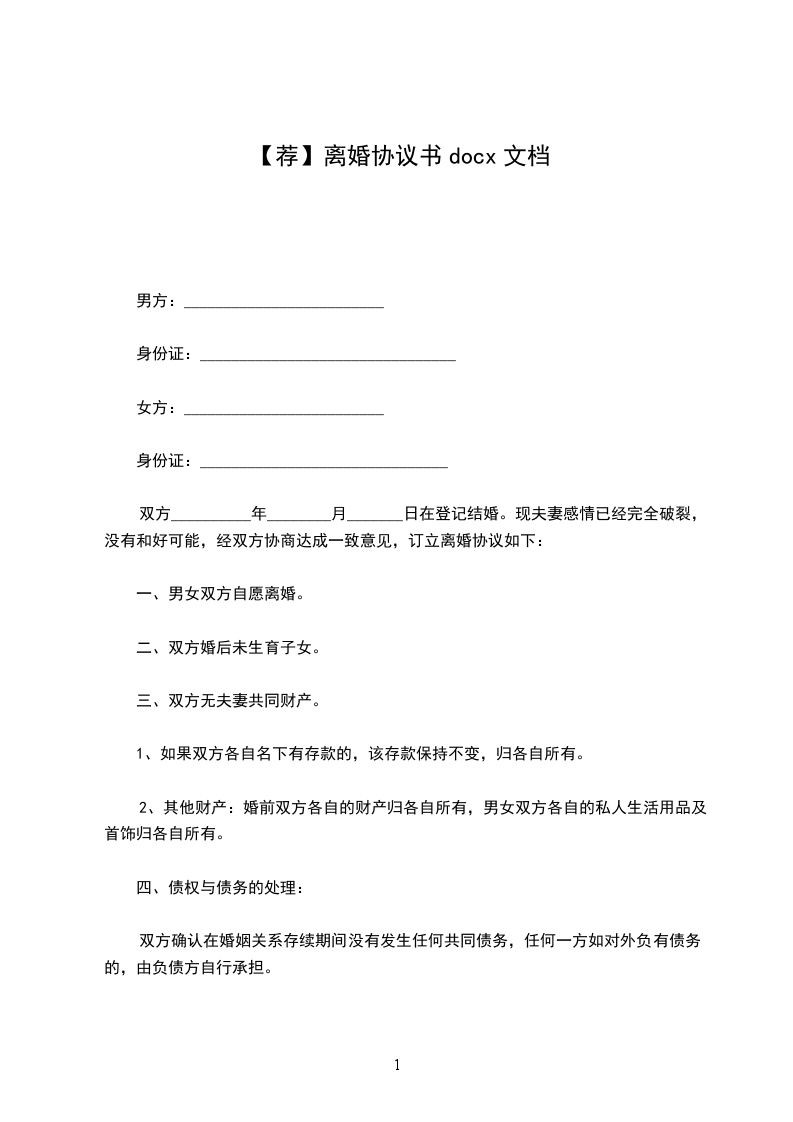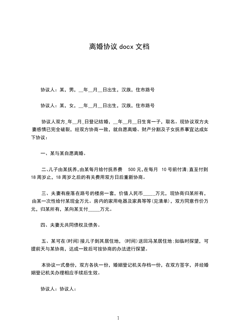 男女双 年 月 日结婚,年月生一女孩,现就离婚事议达成如下协议,供双方遵照执行: