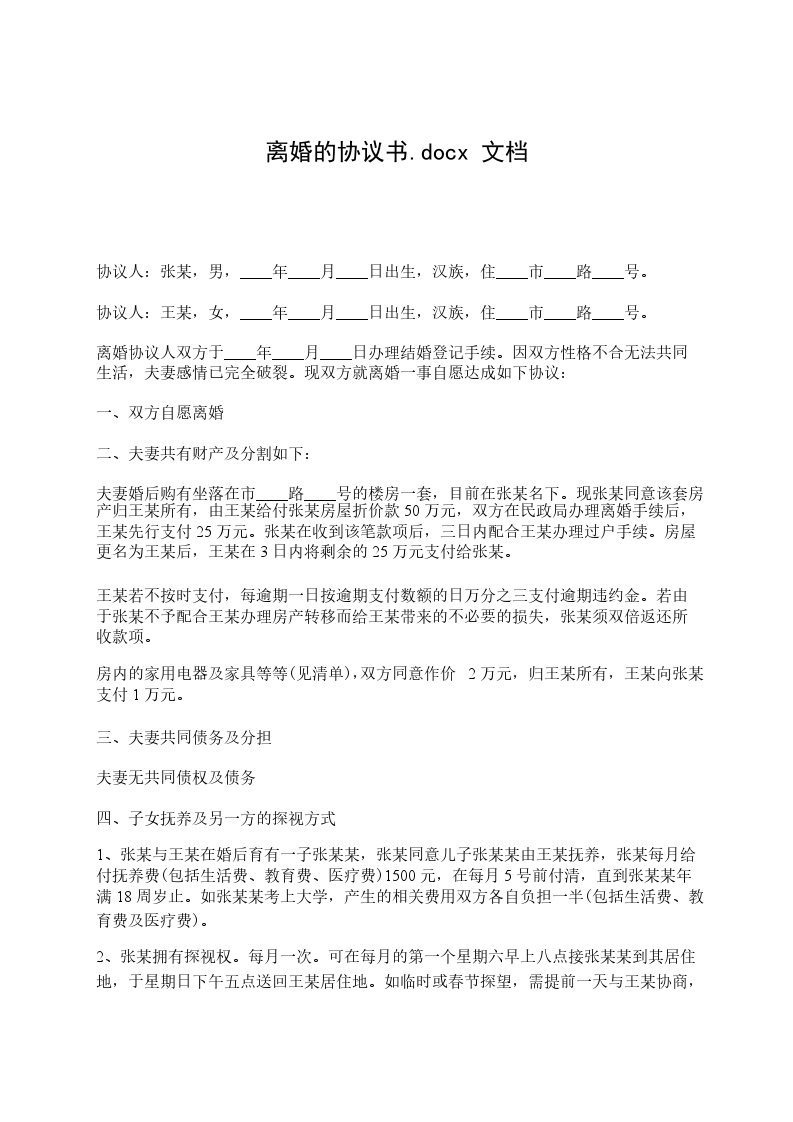 协议人:王某,女,____年____月____日出生,汉族,住____市____路____号。