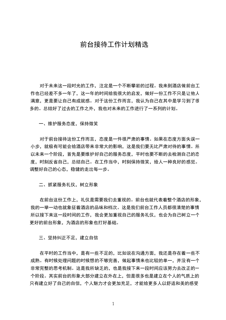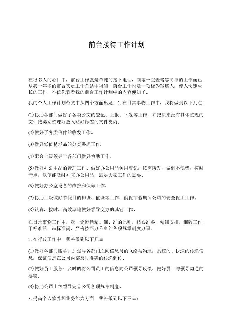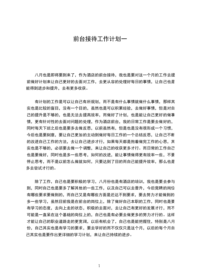 前台接待工作计划回顾入职以来,作为公司的前台接待,在公司各部门领导的关心指导和同事们的支持帮助下,顺利完成了本职工作以及领导交办的各项任务,自身在各方面都有所提升,但也有不足,需要将来不断学习、不断积累工作经验,通过自己的努力弥补自身还存在的缺陷。现将这入职来的工作情况总结如下:
