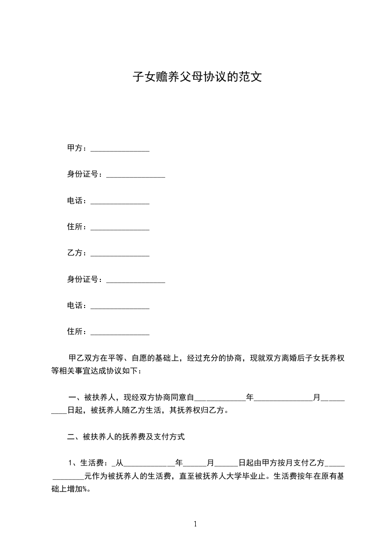 一、被扶养人,现经双方协商同意自_____________年_______________月__________日起,被抚养人随乙方生活,其抚养权归乙方。