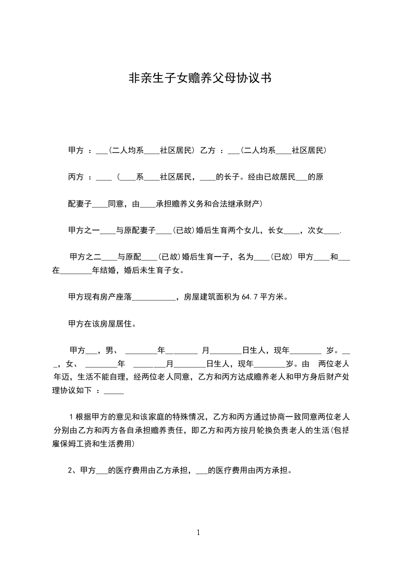1、甲、乙方不分男女都有赡养丙方的义务,各甲、乙方应积极履行对丙方经济供养、生活照料和精神慰藉的义务。