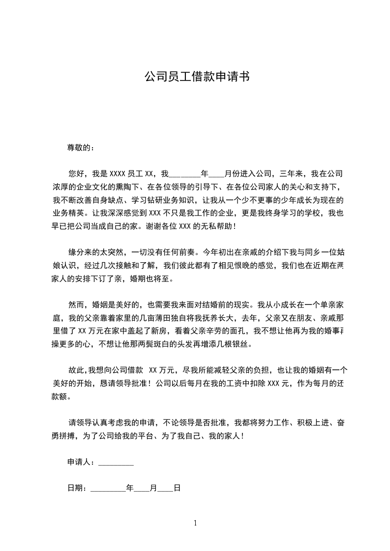 故此,我想向公司借款XX万元,尽我所能减轻父亲的负担,也让我的婚姻有一个美好的开始,恳请领导批准!公司以后每月在我的工资中扣除XXX元,作为每月的还款额。