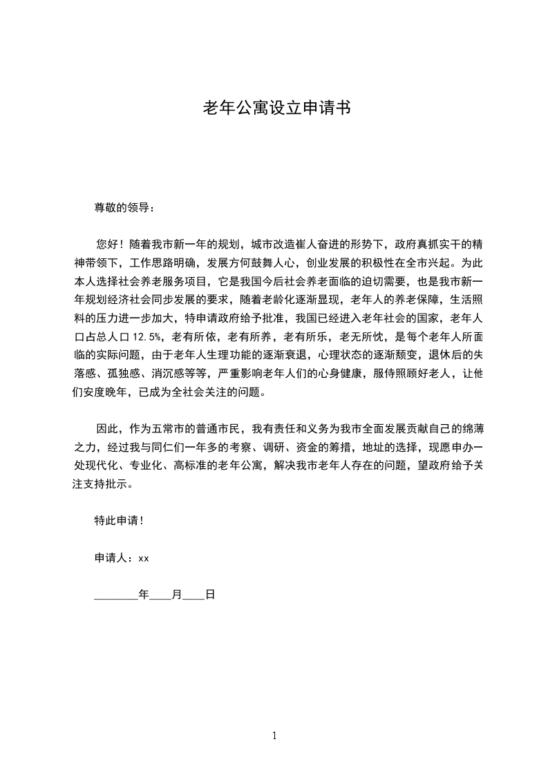 因此,作为五常市的普通市民,我有责任和义务为我市全面发展贡献自己的绵薄之力,经过我与同仁们一年多的考察、调研、资金的筹措,地址的选择,现愿申办一处现代化、专业化、高标准的老年公寓,解决我市老年人存在的问题,望政府给予关注支持批示。