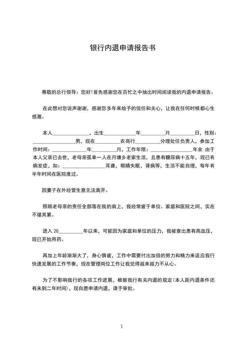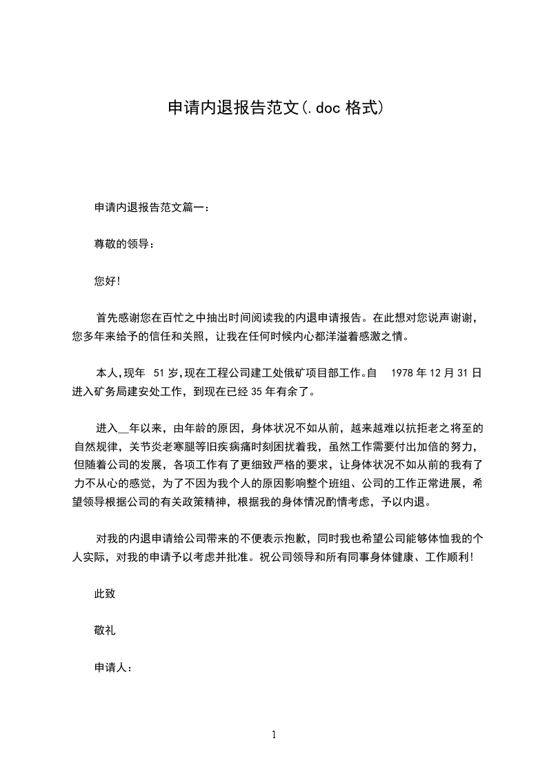 您好!首先感谢您在百忙之中抽出时间阅读我的内退申请报告。在此想对您说声谢谢,您多年来给予的信任和关照,让我在任何时候内心都洋溢着感激之情。