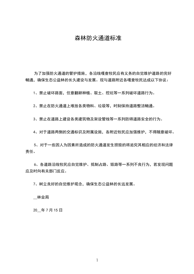 为了加强防火通道的管护措施,各沿线嘎查牧民应有义务的自觉维护道路的完好畅通,确保生态公益林的长久建设与发展。现与道路附近各嘎查牧民达成以下协议: