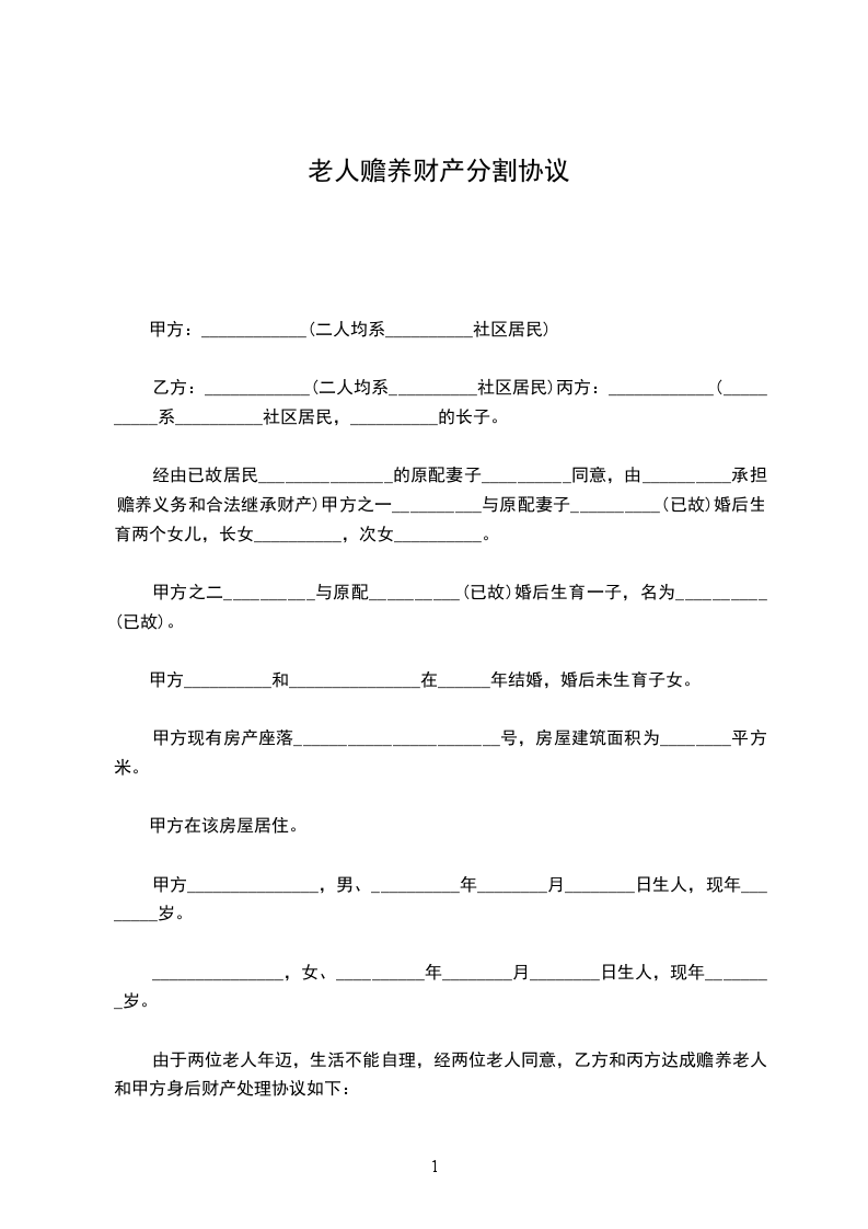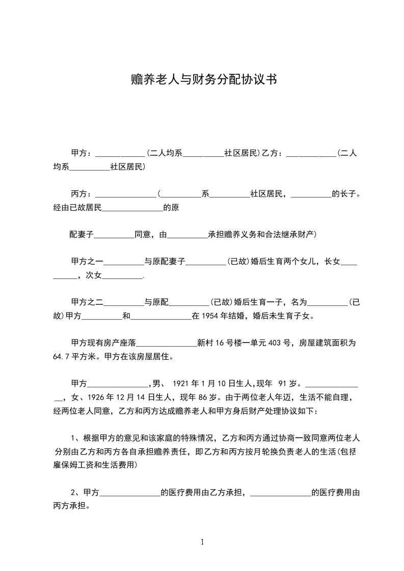 甲方_______________,男、1921年1月10日生人,现年91岁。_______________,女、1926年12月14日生人,现年86岁。由于两位老人年迈,生活不能自理,经两位老人同意,乙方和丙方达成赡养老人和甲方身后财产处理协议如下: