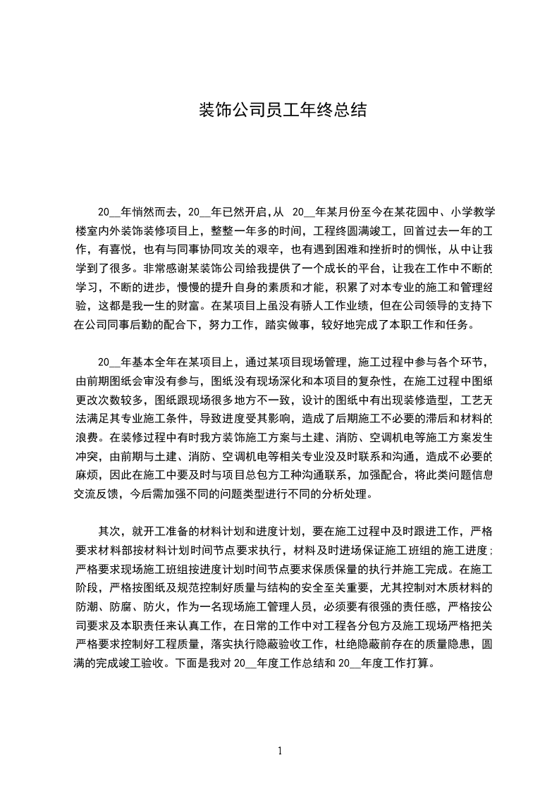 年初以来,在公司的领导和同事们的支持帮助下,我较好地完成了全年的工作任务,先后担任了某广场酒吧装饰工程、防洪处装饰工程、某安防公司装饰工程、某书店装饰工程的监理及某园区装饰工程的项目经理,现将工作情况简要总结如下。