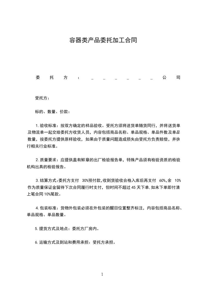 1. 验收标准:按双方确定的样品验收。受托方须将送货单随货同行,并将送货单及物流单一起交给委托方收货人员,内容包括商品名称、单品规格、单品件数及单品数量,按委托方提供原样验收,如果由于质量问题造成损失由受托方负责赔偿,并执行相关行业标准。