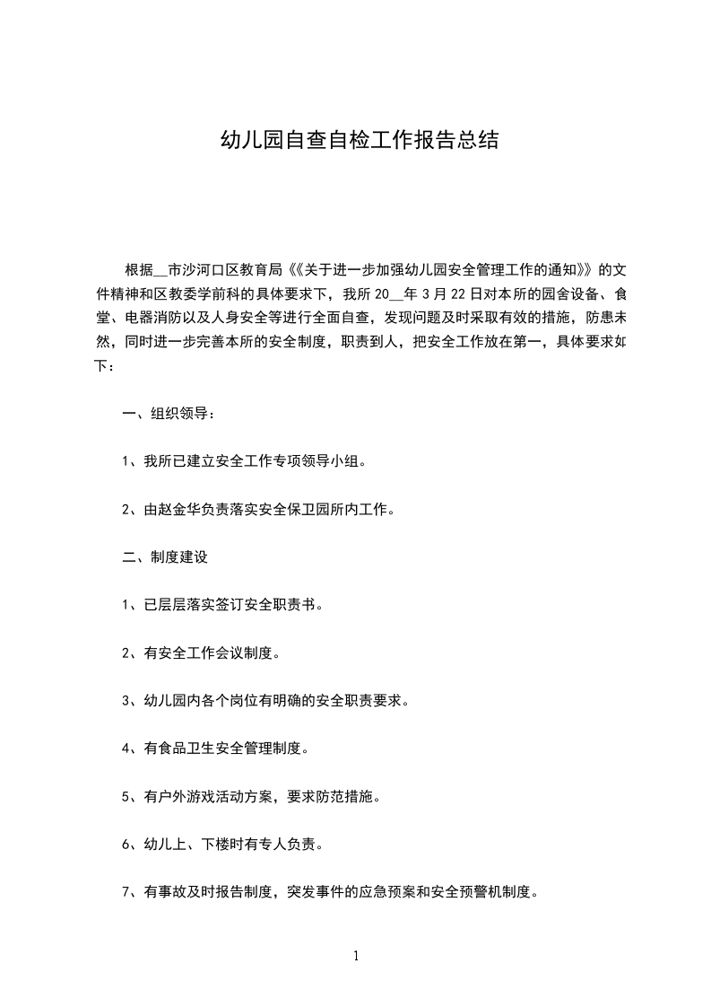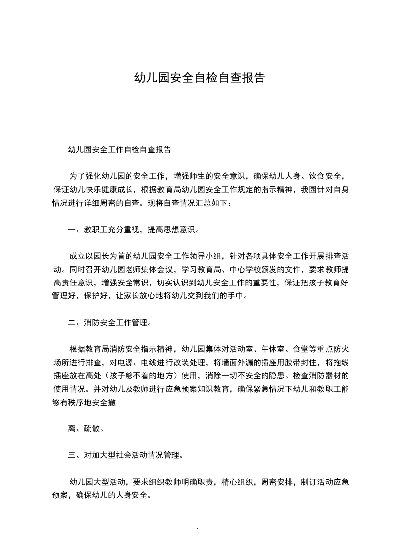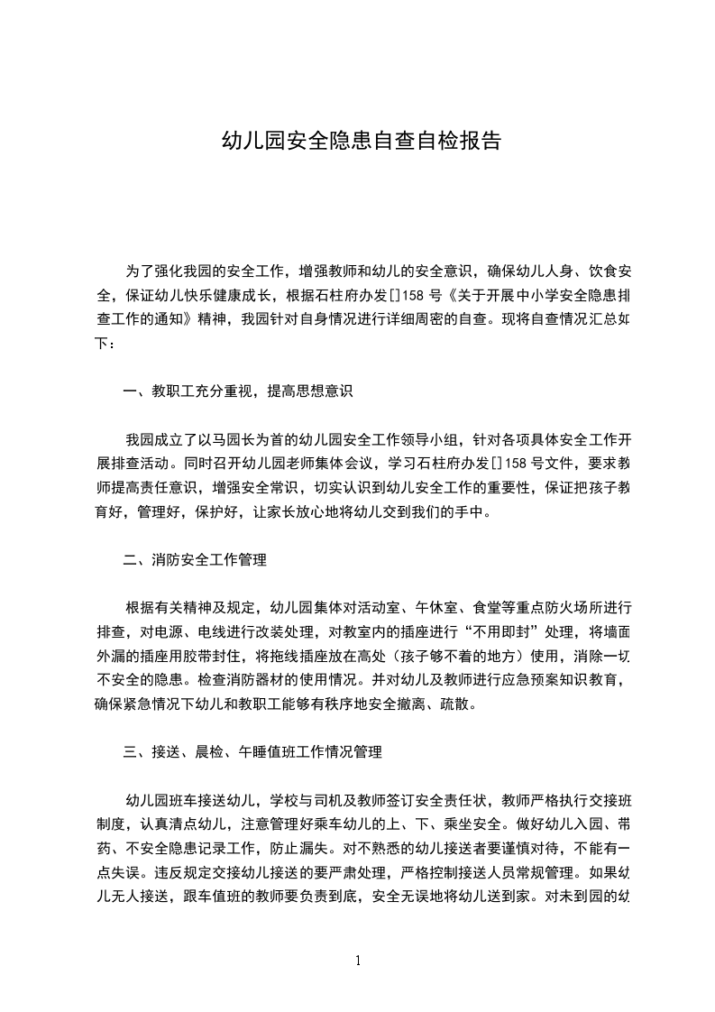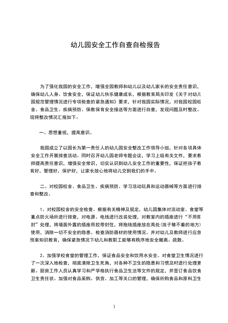为了强化幼儿园的安全工作,增强师生的安全意识,确保幼儿人身、饮食安全,保证幼儿快乐健康成长,根据教育局幼儿园安全工作规定的指示精神,我园针对自身情况进行详细周密的自查。现将自查情况汇总如下: