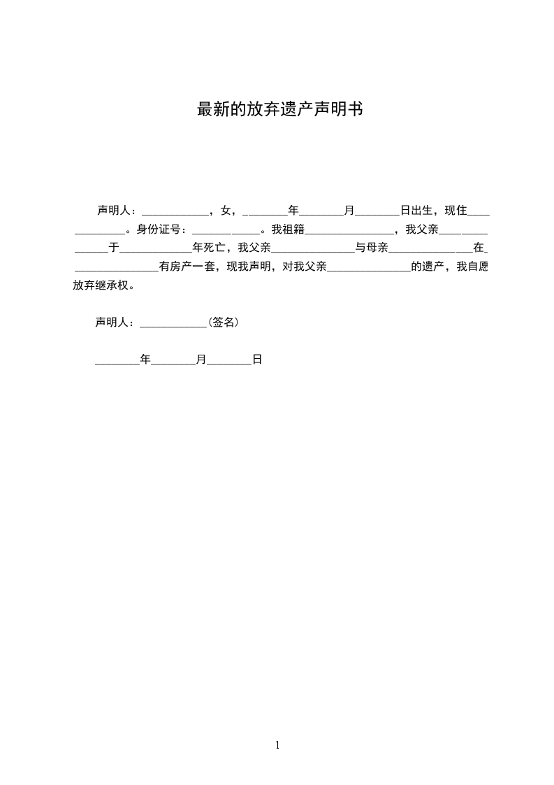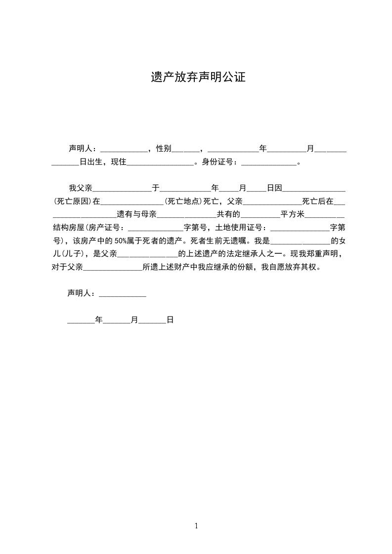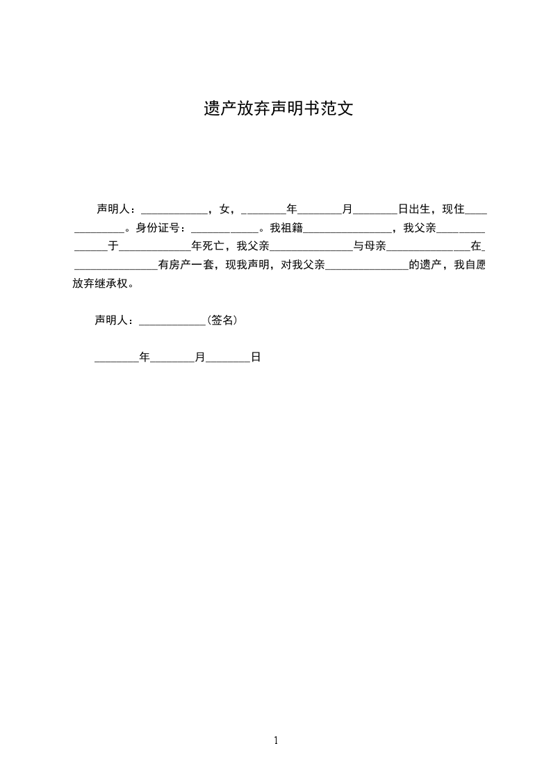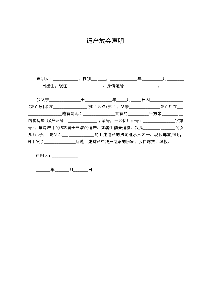 声明人:____________,女,________年________月________日出生,现住_____________。身份证号:____________。我祖籍________________,我父亲_______________于_____________年死亡,我父亲_______________与母亲_______________在________________有房产一套,现我声明,对我父亲_______________的遗产,我自愿放弃继承权。
