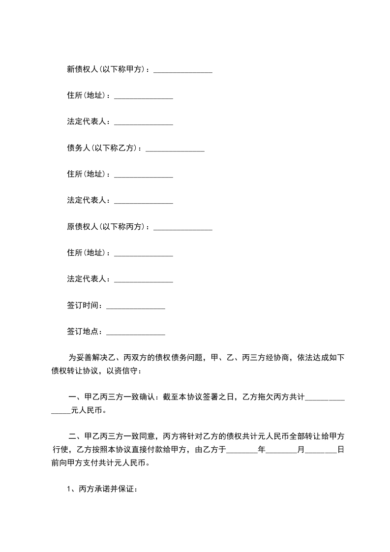 二、甲乙丙三方一致同意,丙方将针对乙方的债权共计元人民币全部转让给甲方行使,乙方按照本协议直接付款给甲方,由乙方于________年________月________日前向甲方支付共计元人民币。