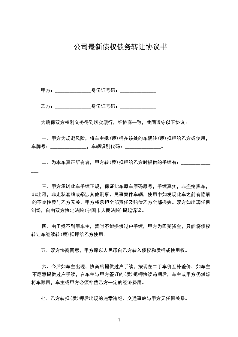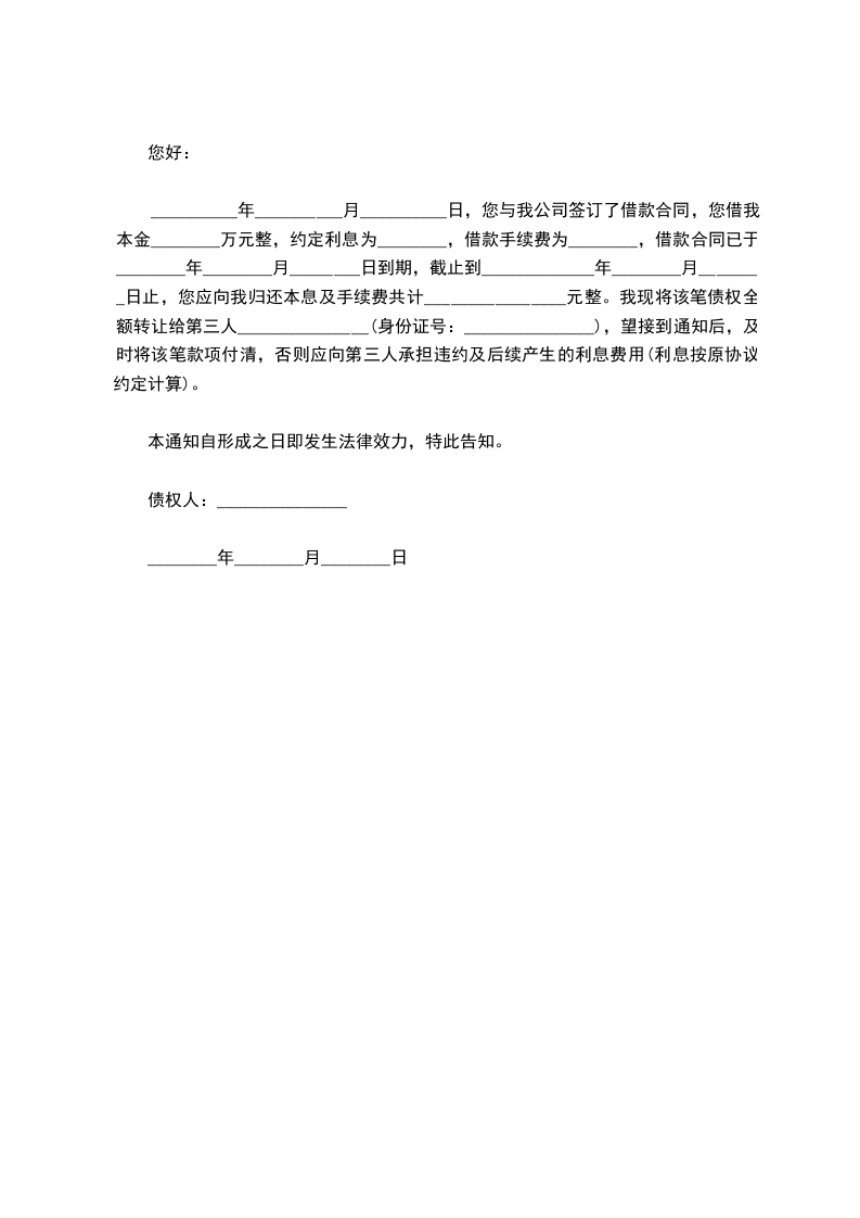 __________年__________月__________日,您与我公司签订了借款合同,您借我本金________万元整,约定利息为________,借款手续费为________,借款合同已于________年________月________日到期,截止到_____________年________月________日止,您应向我归还本息及手续费共计________________元整。我现将该笔债权全额转让给第三人_______________(身份证号:_______________),望接到通知后,及时将该笔款项付清,否则应向第三人承担违约及后续产生的利息费用(利息按原协议约定计算)。