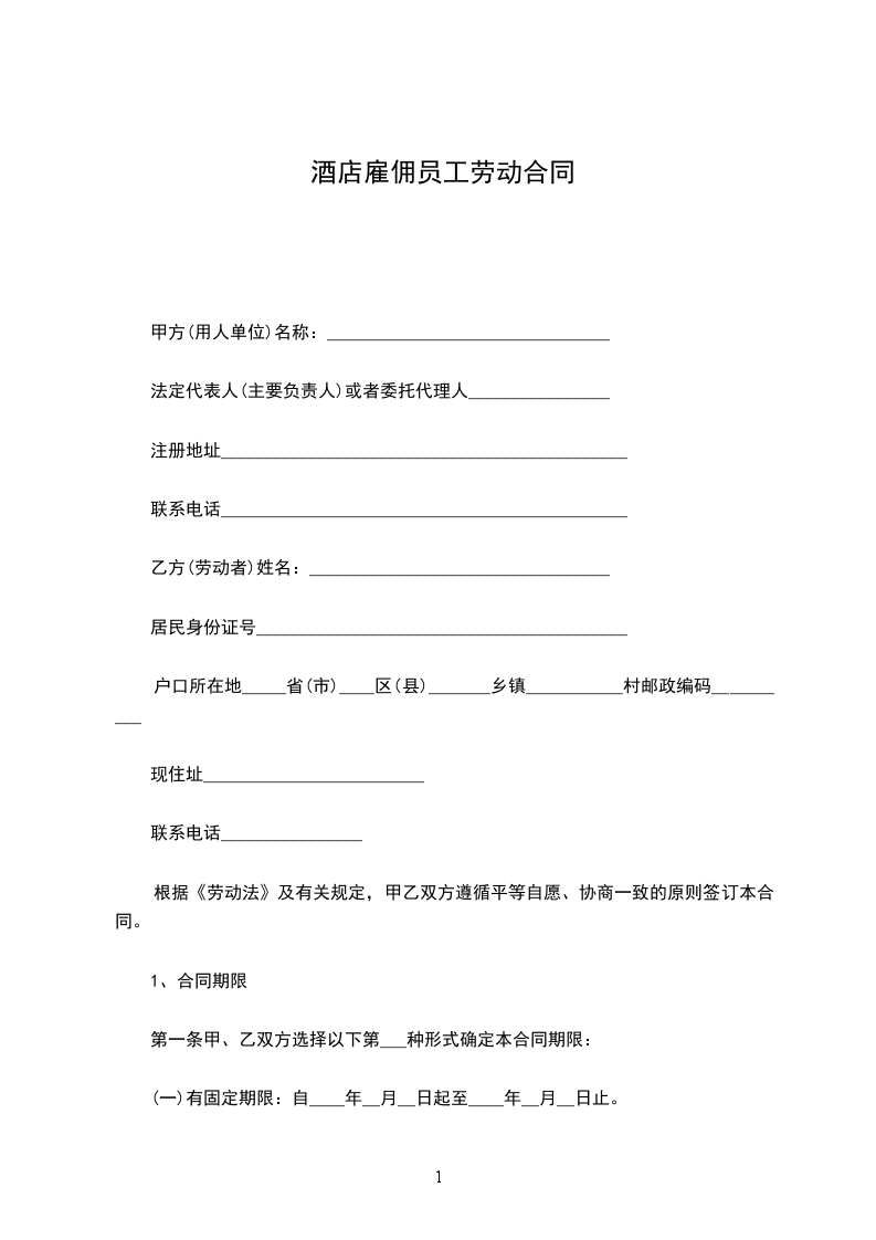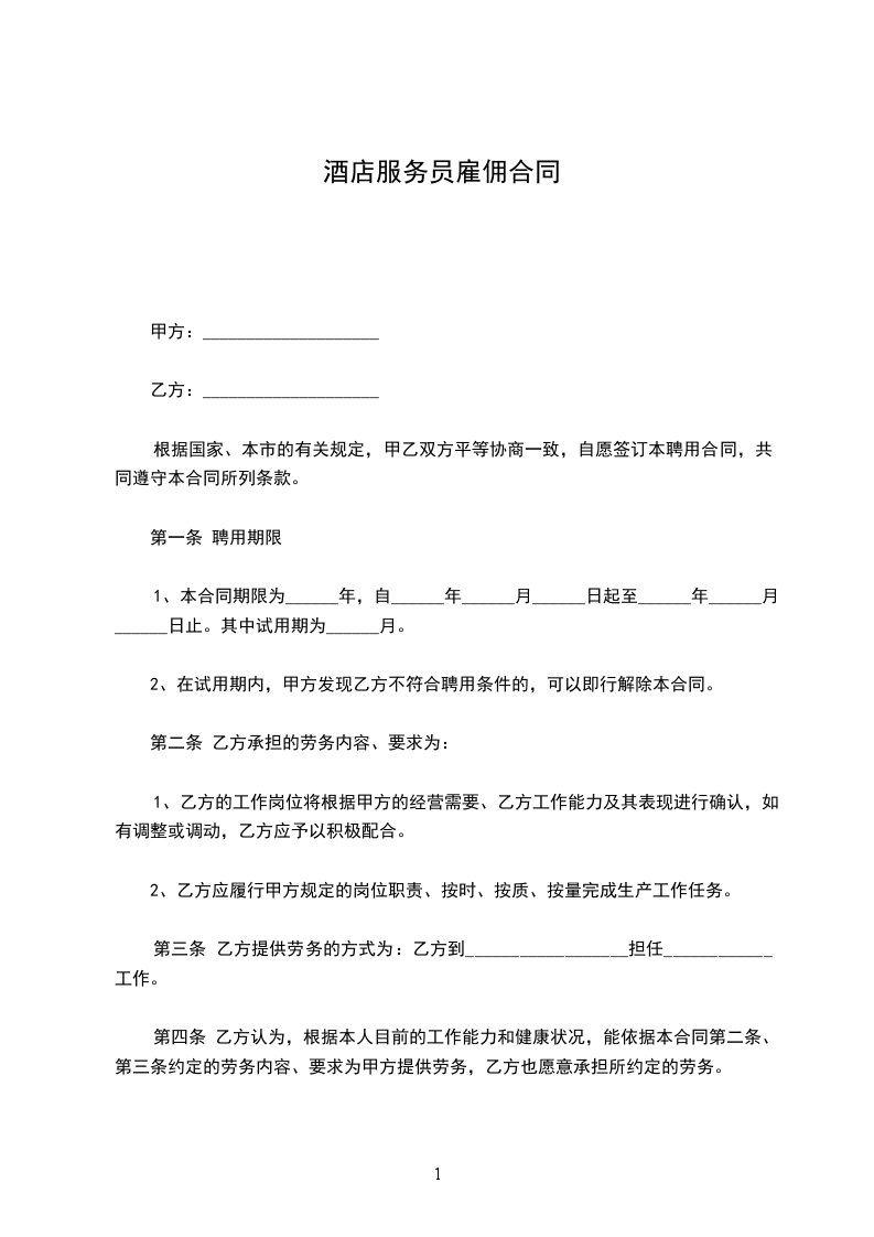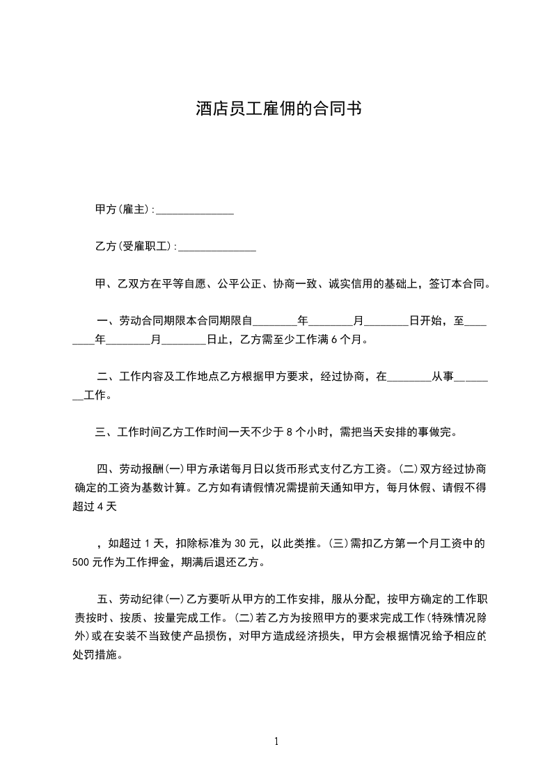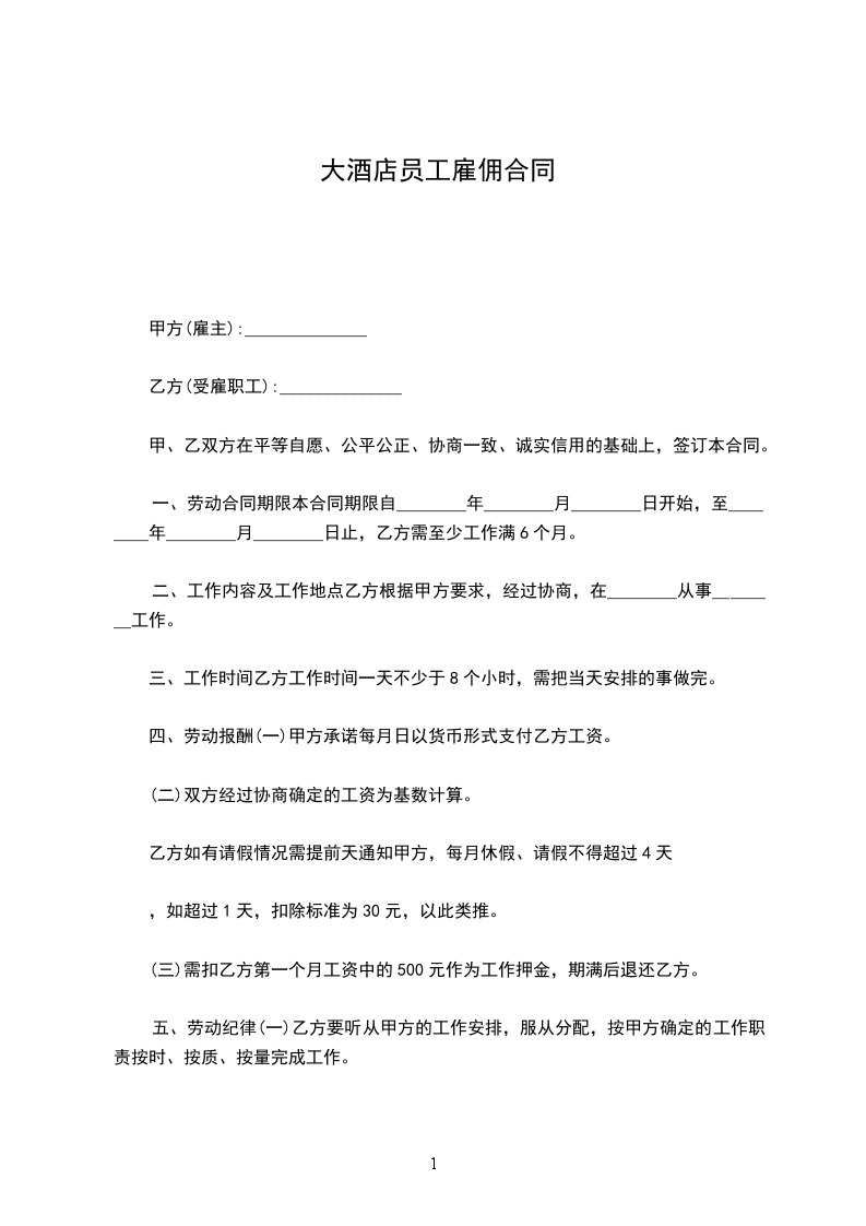 最新酒店员工雇佣的合同范本