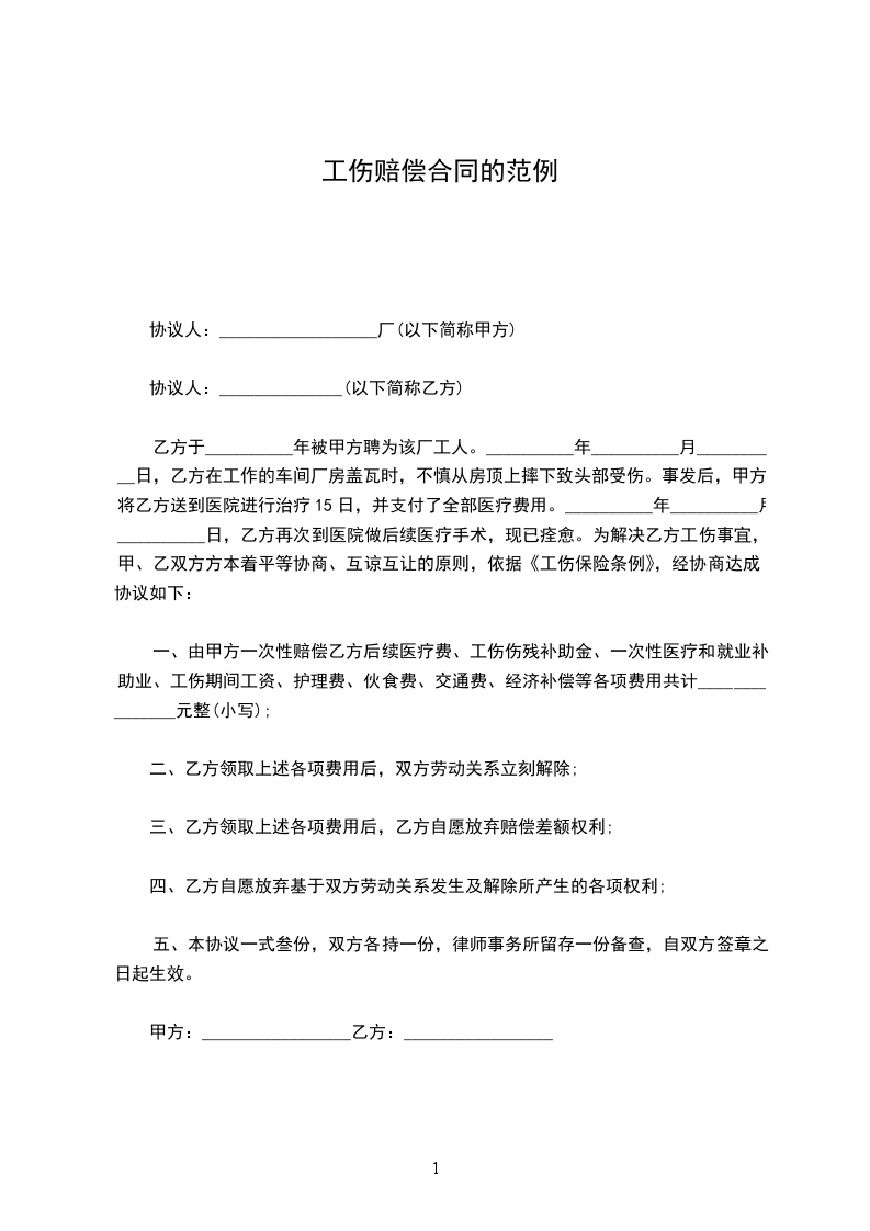 乙方于__________年被甲方聘为该厂工人。__________年__________月__________日,乙方在工作的车间厂房盖瓦时,不慎从房顶上摔下致头部受伤。事发后,甲方将乙方送到医院进行治疗15日,并支付了全部医疗费用。__________年__________月__________日,乙方再次到医院做后续医疗手术,现已痊愈。为解决乙方工伤事宜,甲、乙双方方本着平等协商、互谅互让的原则,依据《工伤保险条例》,经协商达成协议如下: