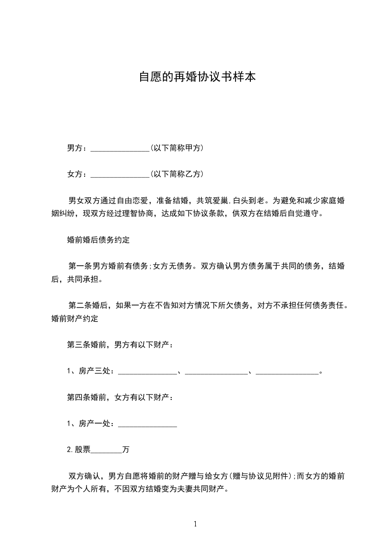 男女双方通过自由恋爱,准备结婚,共筑爱巢,白头到老。为避免和减少家庭婚姻纠纷,现双方经过理智协商,达成如下协议条款,供双方在结婚后自觉遵守。