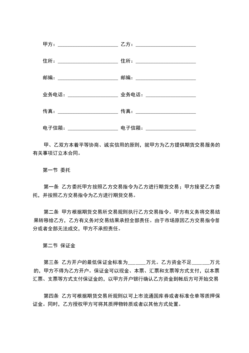 第一条 乙方委托甲方按照乙方交易指令为乙方进行期货交易;甲方接受乙方委托,并按照乙方交易指令为乙方进行期货交易。