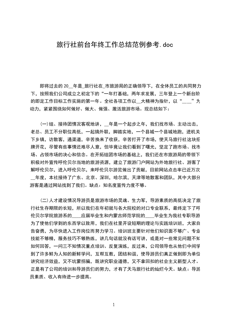(一)组、接待团情况客观地讲,__年是一个起步之年,我们找市场、主动出击,老总、员工不分职位高低,一起搞外联,脚踏实地,一个县城一个县城地跑,进机关,下乡镇,访散客,通渠道,辛苦换来了收获,辛苦打开了市场,使天马旅行社这块招牌开花,尽管有些事情还难尽人意,但毕竟让我们看到了曙光,坚定了跑市场、找市场、占领市场的决心和信念。在开拓组团市场的基础上,我们还在市旅游局的带领下,积极对外宣传呼伦贝尔当地的旅游资源,建立了旅游门户网站为外地旅行社、游客了解呼伦贝尔,进入呼伦贝尔,来呼伦贝尔游览做出了贡献,目前网站点击率已近万次。__年度,本社接待了广东、北京、深圳,哈尔滨,天津等地散客和团队,其中大部分游客是通过网站找到了我们。缺点:知名度宣传力度不够。