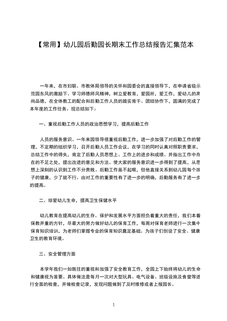人员的服务意识。一年来园领导很重视后勤工作,进一步加强了对后勤工作的管理,不定期的组织学习,召开后勤人员工作会议,在学习的同时认真对照职责要求,总结工作中的得失,肯定了后勤人员思想上、工作上的进步和成绩。并指出工作中存在的不足之处,提出改进的意见和方法。使大家的服务意识进一步得到了提高,从思想上深刻的认识到工作不分贵贱。后勤工作虽不起眼,但他直接关系到幼儿园每个孩子的健康,少了就不行。由对工作的重要性有了进一步的明确,后勤服务有了进一步的提高。