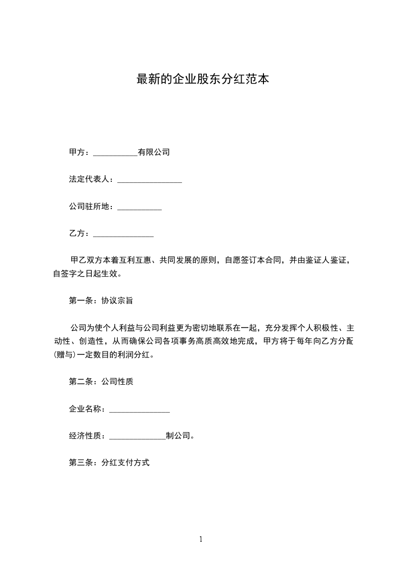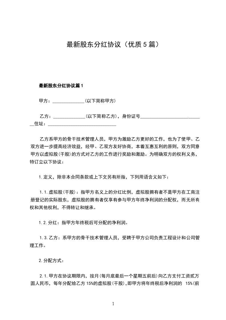 1、在公司经营活动中所得利润扣除各项开支,仍得以盈利的前提下,甲方从盈余中抽取______%的资金将对乙方予以分红。红利支付时间为每年的______月______日,以现金方式支付。