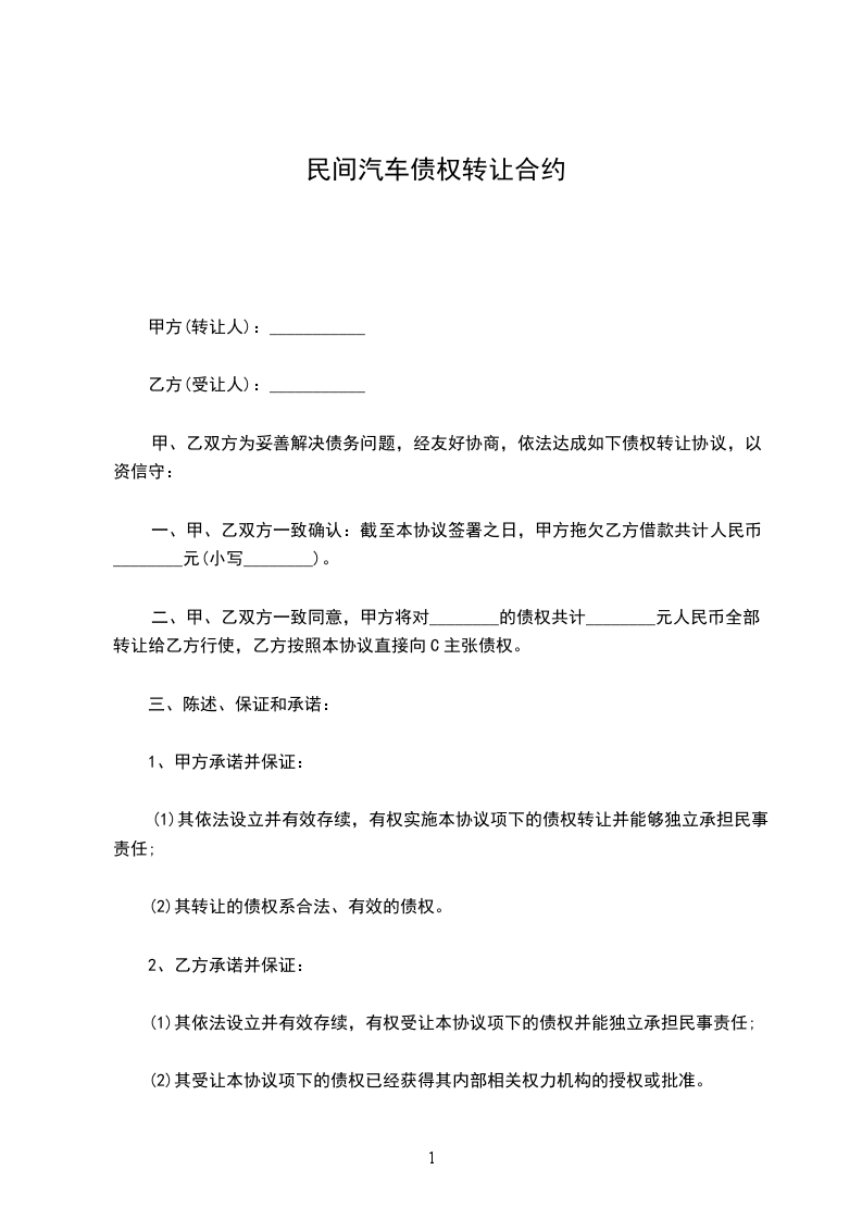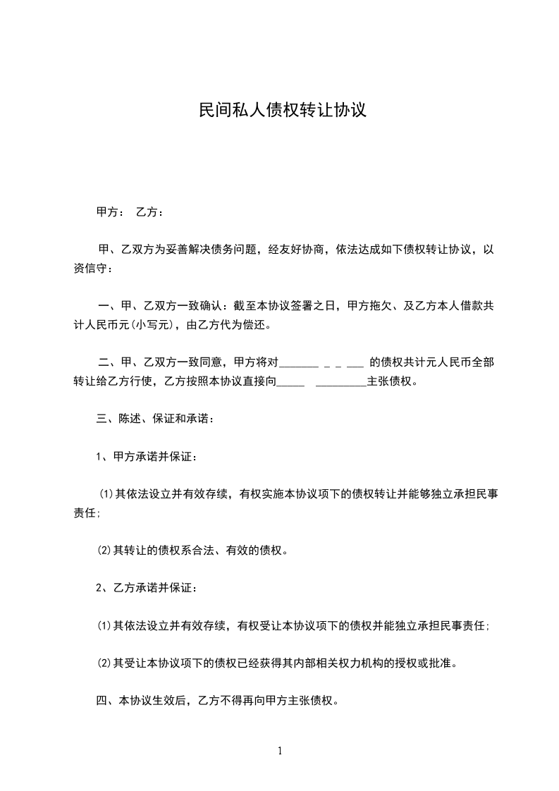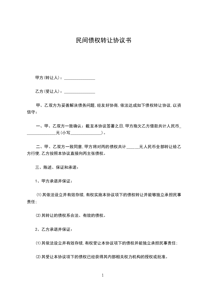 二、甲、乙双方一致同意,甲方将对____________的债权共计_________________元人民币全部转让给乙方行使,乙方按照本协议直接向____________主张债权。