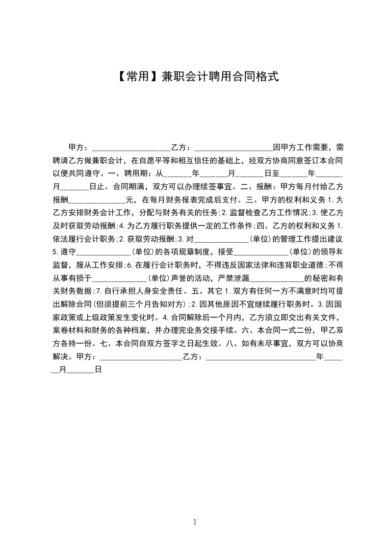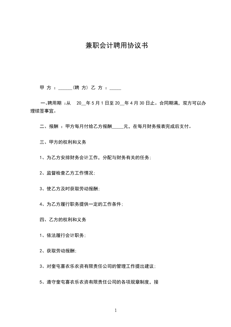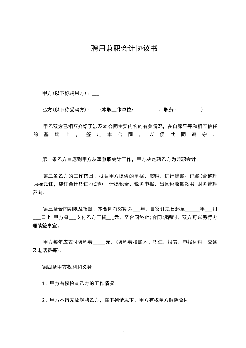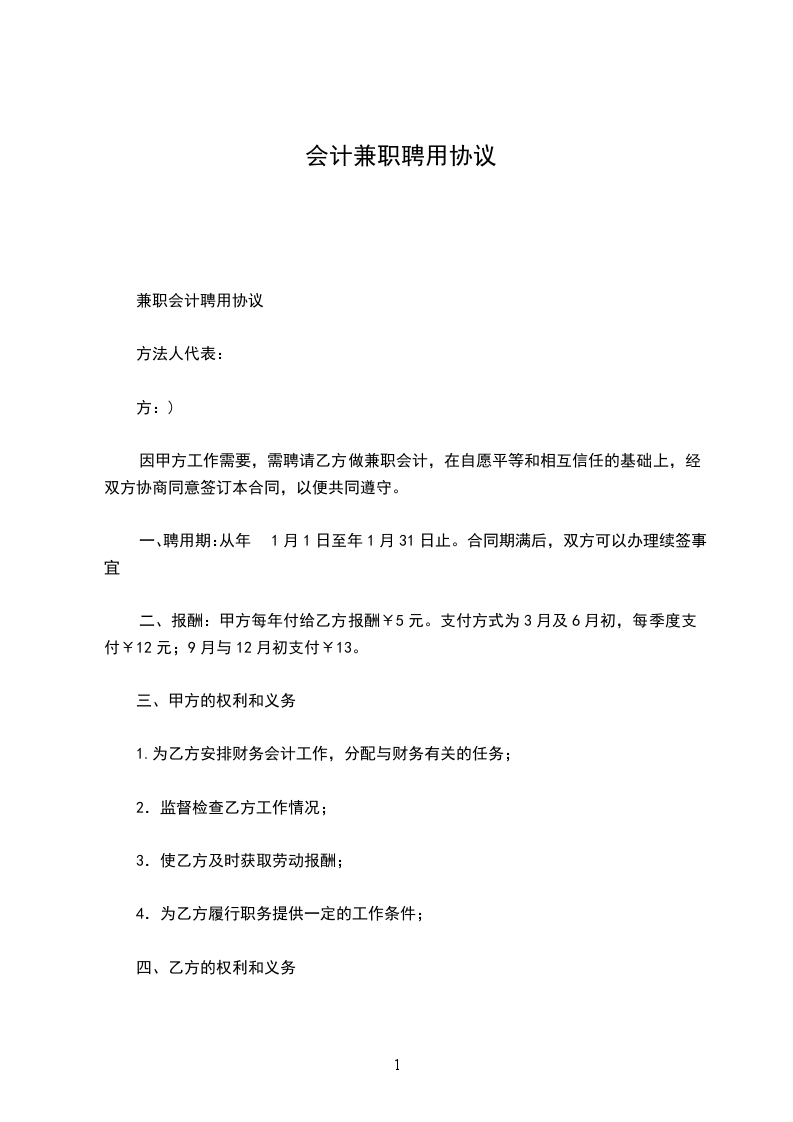 因甲方工作需要,需聘请乙方做兼职会计,在自愿平等和相互信任的基础上,经双方协商同意签订本合同,以便共同遵守。