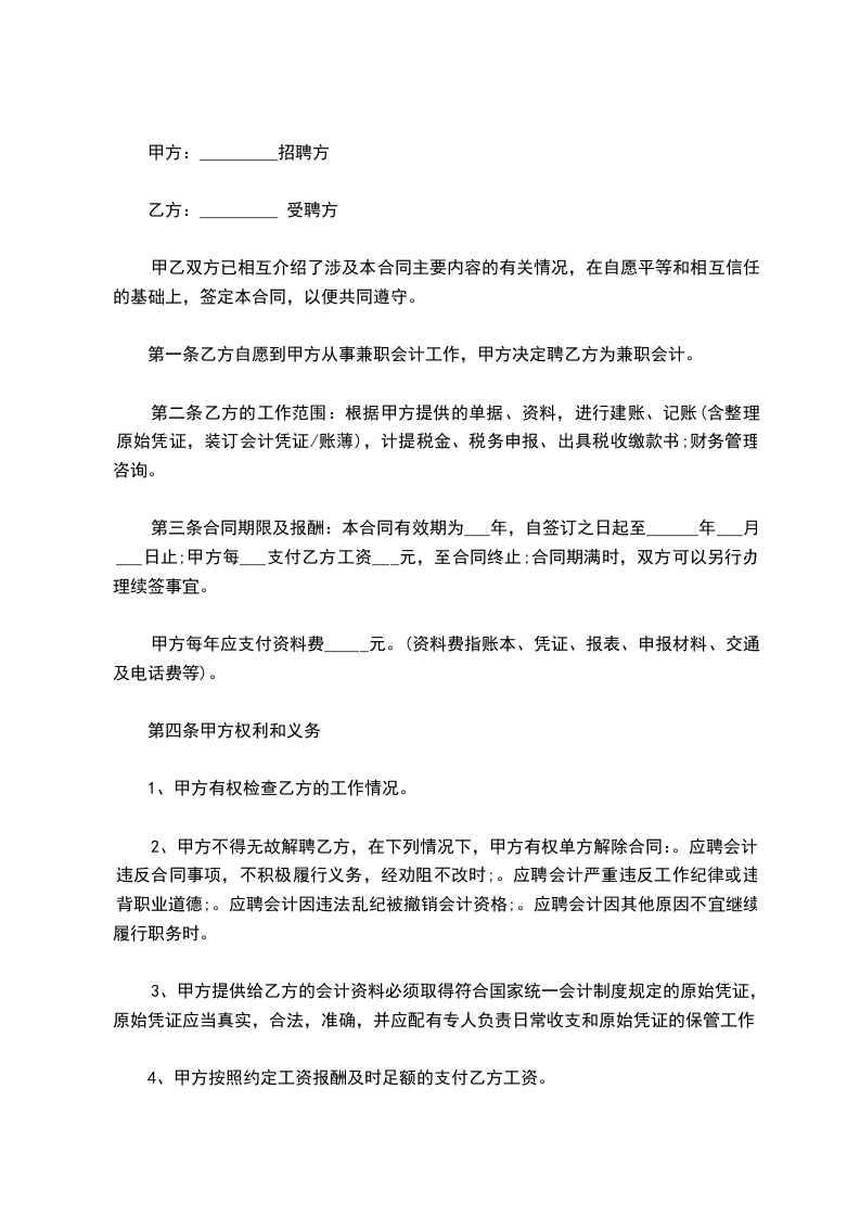 二、报酬:甲方每月付给乙方报酬______________元,在每月财务报表完成后支付。