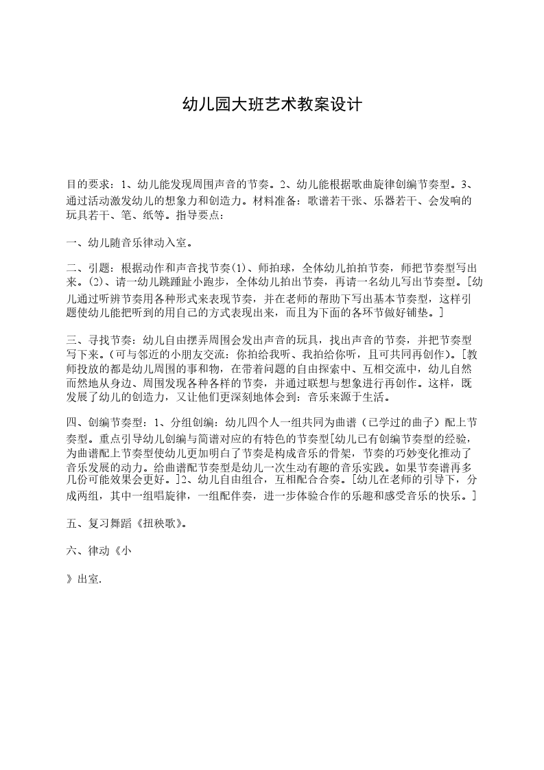 目的要求:1、幼儿能发现周围声音的节奏。2、幼儿能根据歌曲旋律创编节奏型。3、通过活动激发幼儿的想象力和创造力。材料准备:歌谱若干张、乐器若干、会发响的玩具若干、笔、纸等。指导要点: