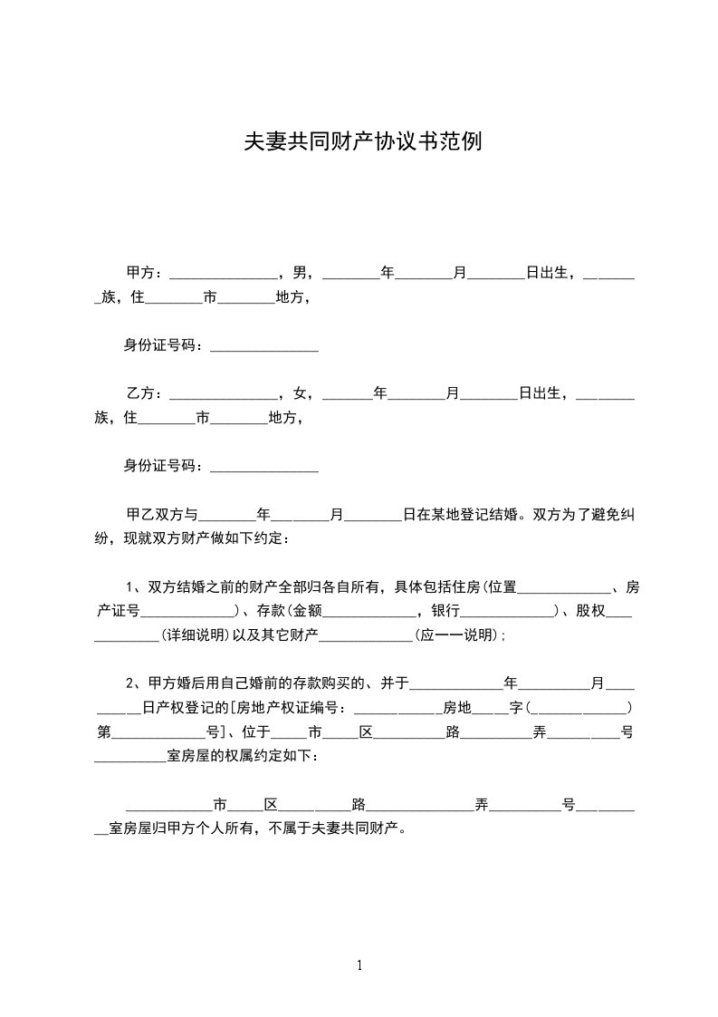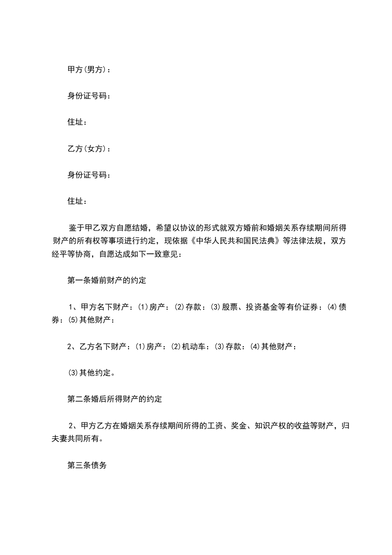 1、双方结婚之前的财产全部归各自所有,具体包括住房(位置_____________、房产证号_____________)、存款(金额_____________,银行_____________)、股权_____________(详细说明)以及其它财产_____________(应一一说明);